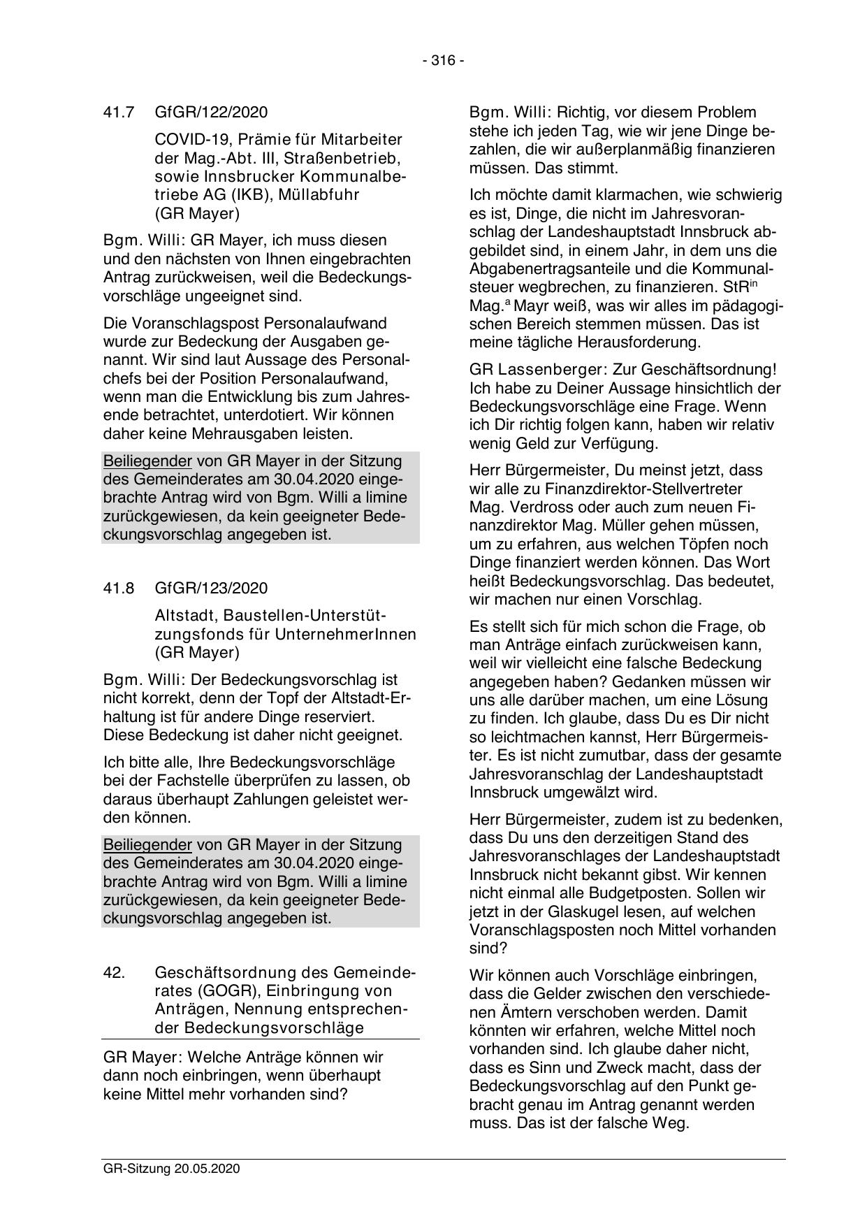 Bgm. Willi: Der Bedeckungsvorschlag ist