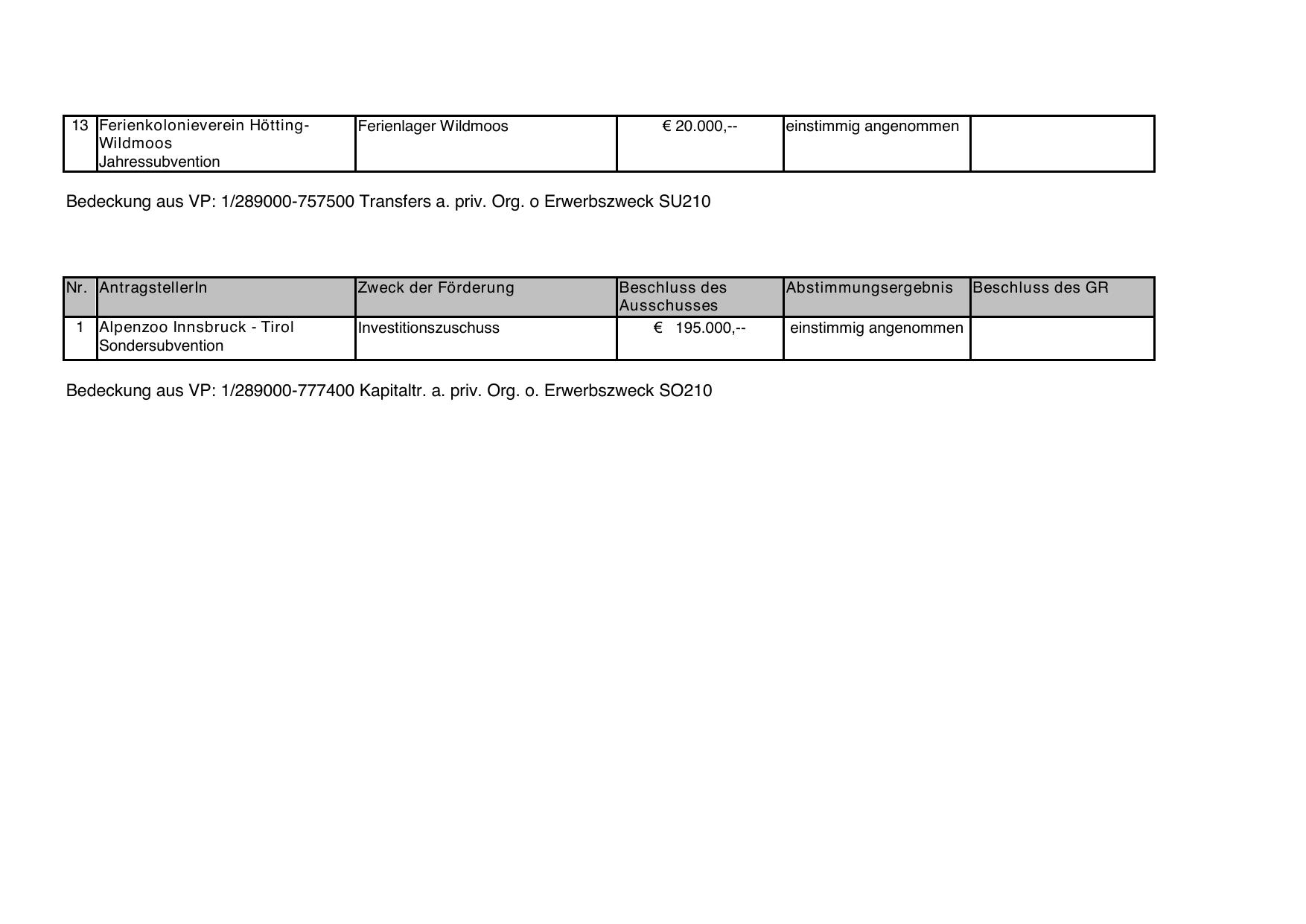 Bedeckung aus VP: 1/289000-777400 Kapitaltr. a. priv. Org. o. Erwerbszweck SO210
