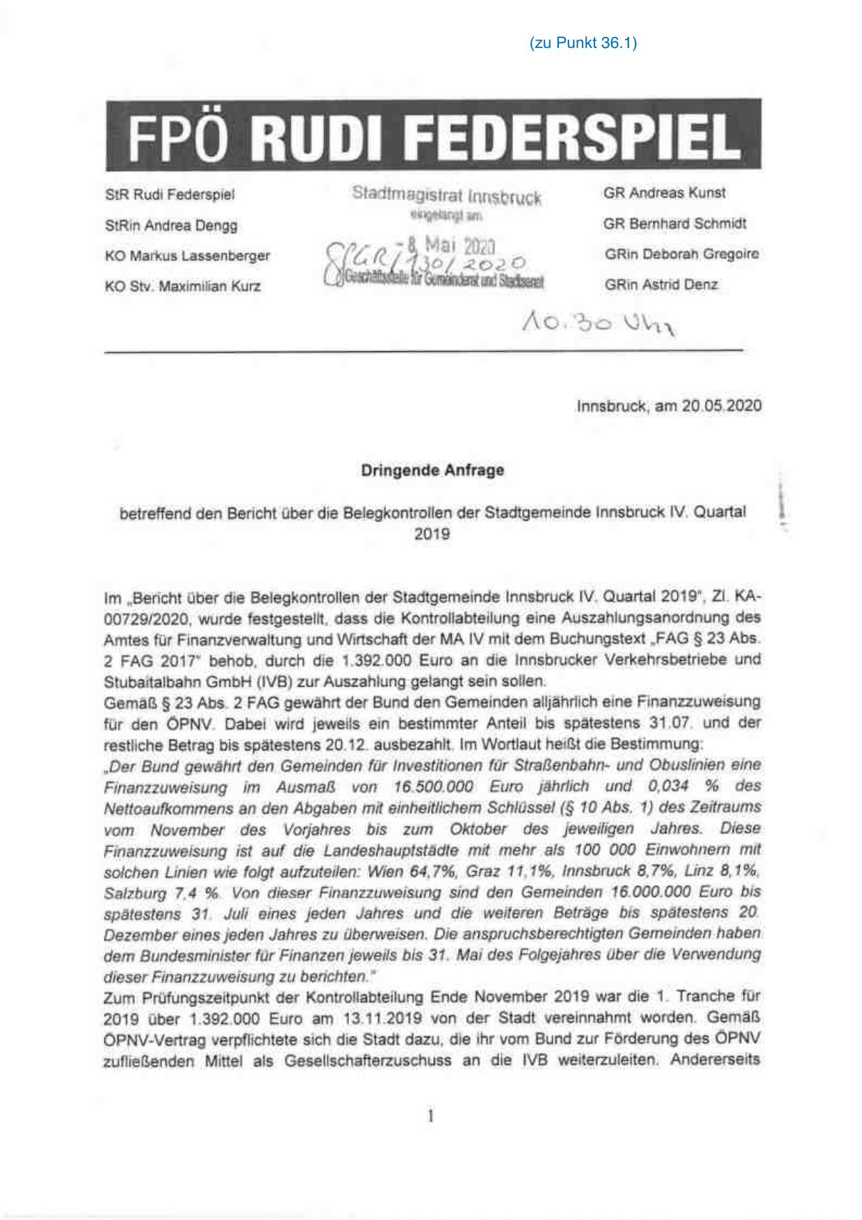 Im „ Bericht über die Belegkontrollen der Stadtgemeinde Innsbruck IV. Quartal 2019" , ZI. KA00729/2020, wurde festgestellt , dass die Kontrollabteilung eine Auszahlungsanordnung des