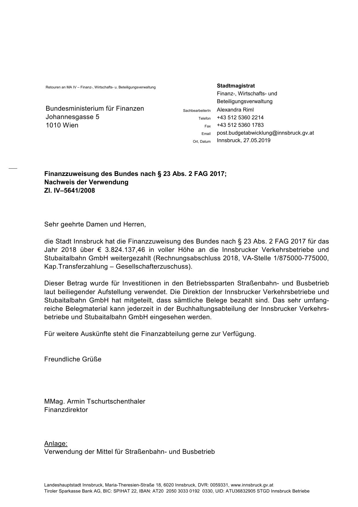 Jahr 2018 über € 3.824.137,46 in voller Höhe an die Innsbrucker Verkehrsbetriebe und