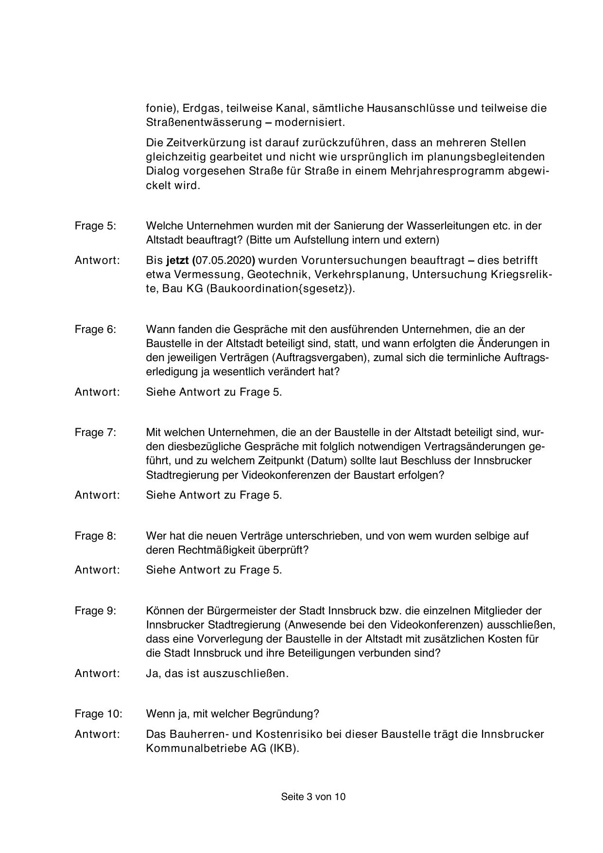 Mit welchen Unternehmen, die an der Baustelle in der Altstadt beteiligt sind, wurden diesbezügliche Gespräche mit folglich notwendigen Vertragsänderungen geführt, und zu welchem Zeitpunkt (Datum) sollte laut Beschluss der Innsbrucker