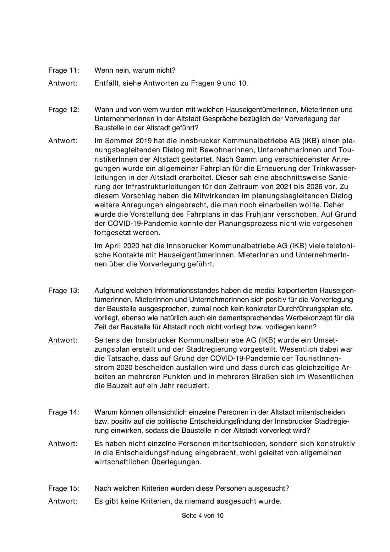 Im Sommer 2019 hat die Innsbrucker Kommunalbetriebe AG (IKB) einen planungsbegleitenden Dialog mit BewohnerInnen, UnternehmerInnen und TouristikerInnen der Altstadt gestartet. Nach Sammlung verschiedenster Anregungen wurde ein allgemeiner Fahrplan für die Erneuerung der Trinkwasserleitungen in der Altstadt erarbeitet. Dieser sah eine abschnittsweise Sanierung der Infrastrukturleitungen für den Zeitraum von 2021 bis 2026 vor. Zu