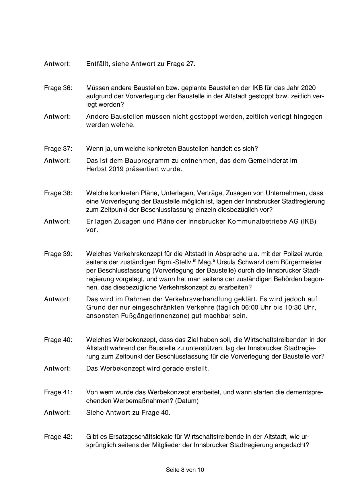 Altstadt während der Baustelle zu unterstützen, lag der Innsbrucker Stadtregierung zum Zeitpunkt der Beschlussfassung für die Vorverlegung der Baustelle vor?