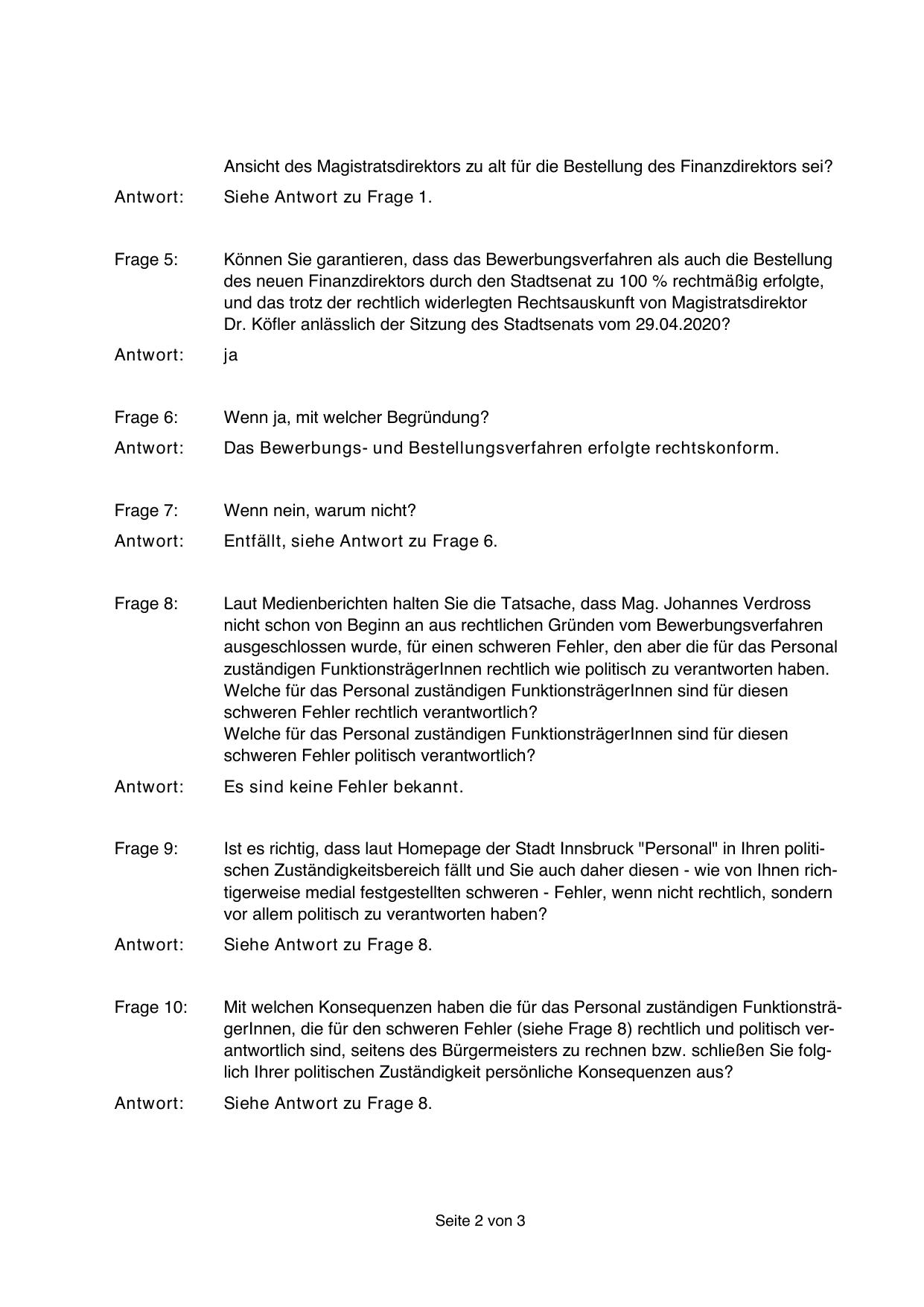 Ist es richtig, dass laut Homepage der Stadt Innsbruck "Personal" in Ihren politischen Zuständigkeitsbereich fällt und Sie auch daher diesen - wie von Ihnen richtigerweise medial festgestellten schweren - Fehler, wenn nicht rechtlich, sondern