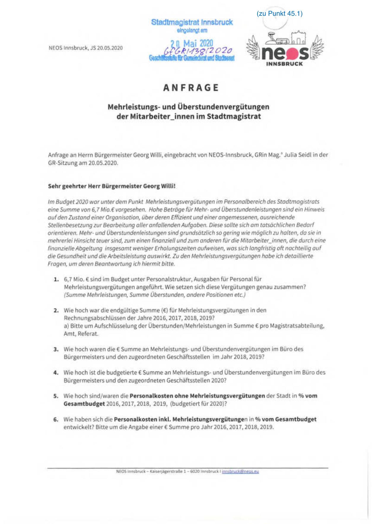 Anfrage an Herrn Bü rgermeister Georg Willi, eingebracht von NEOS-Innsbruck, GRin Mag. Julia Seidl in der
