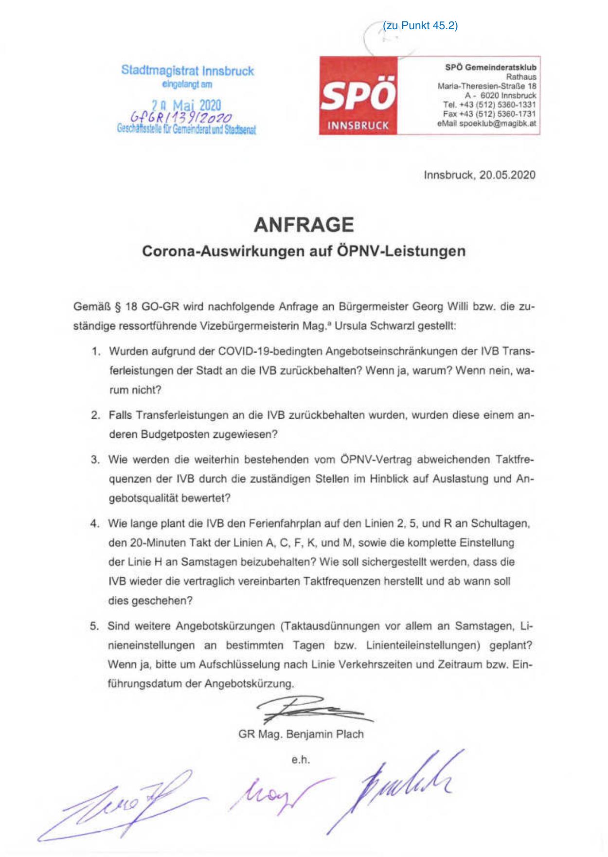 Gemäß § 18 GO-GR wird nachfolgende Anfrage an Bürgermeister Georg Willi bzw. die zuständige ressortf ührende Vizebürgermeisterin Mag.3 Ursula Schwarzl gestellt: