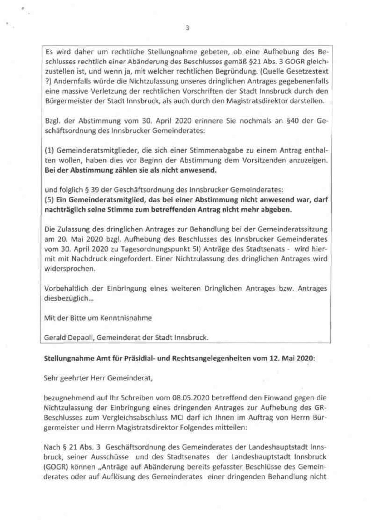 am 20. Mai 2020 bzgl. Aufhebung des Beschlusses des Innsbrucker Gemeinderates