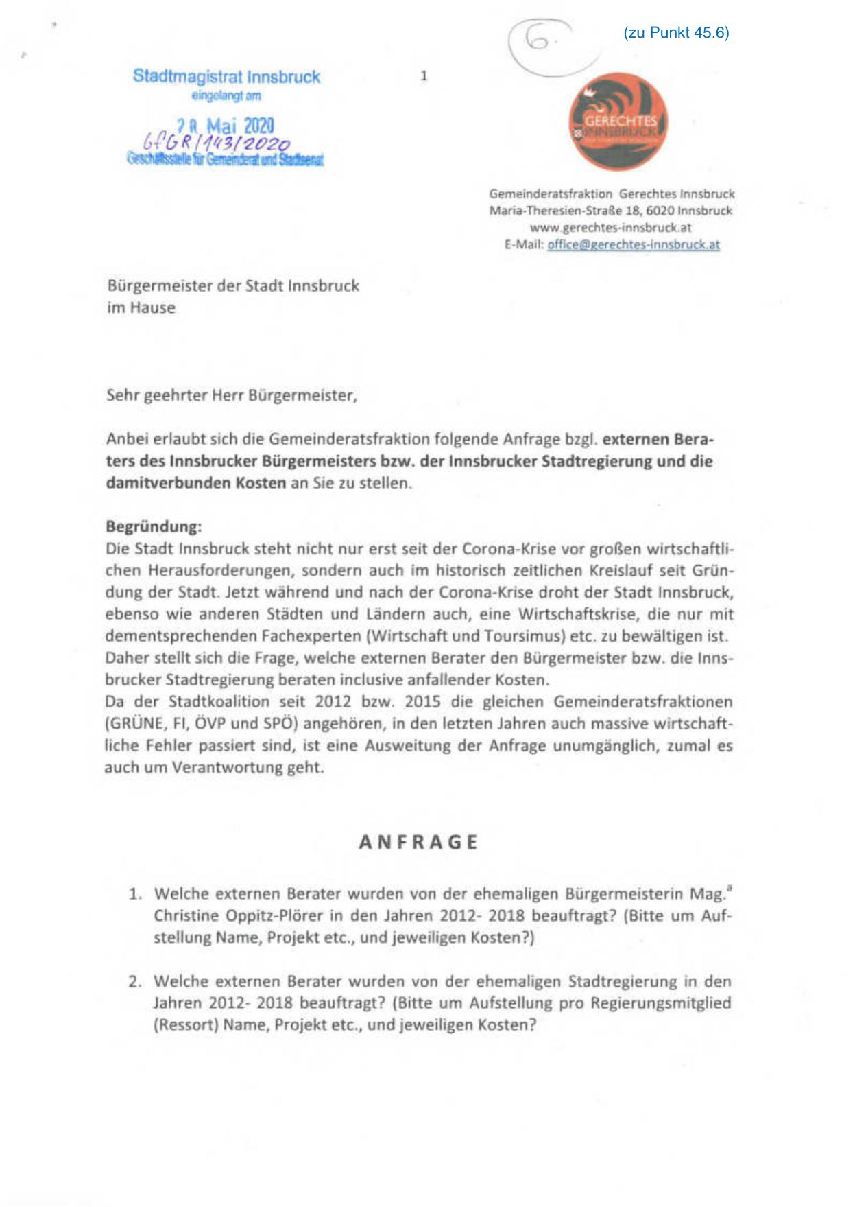 Anbei erlaubt sich die Gemeinderatsfraktion folgende Anfrage bzgl. externen Beraters des Innsbrucker Bürgermeisters bzw. der Innsbrucker Stadtregierung und die