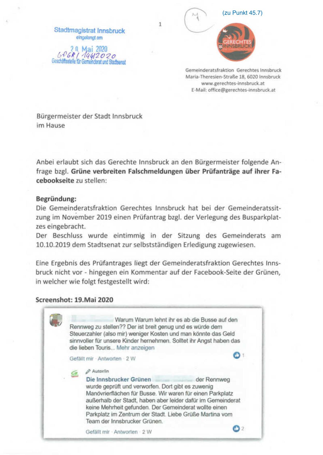 Anbei erlaubt sich das Gerechte Innsbruck an den Bü rgermeister folgende Anfrage bzgl. Grüne verbreiten Falschmeldungen über Prüfantr äge auf ihrer Facebookseite zu stellen: