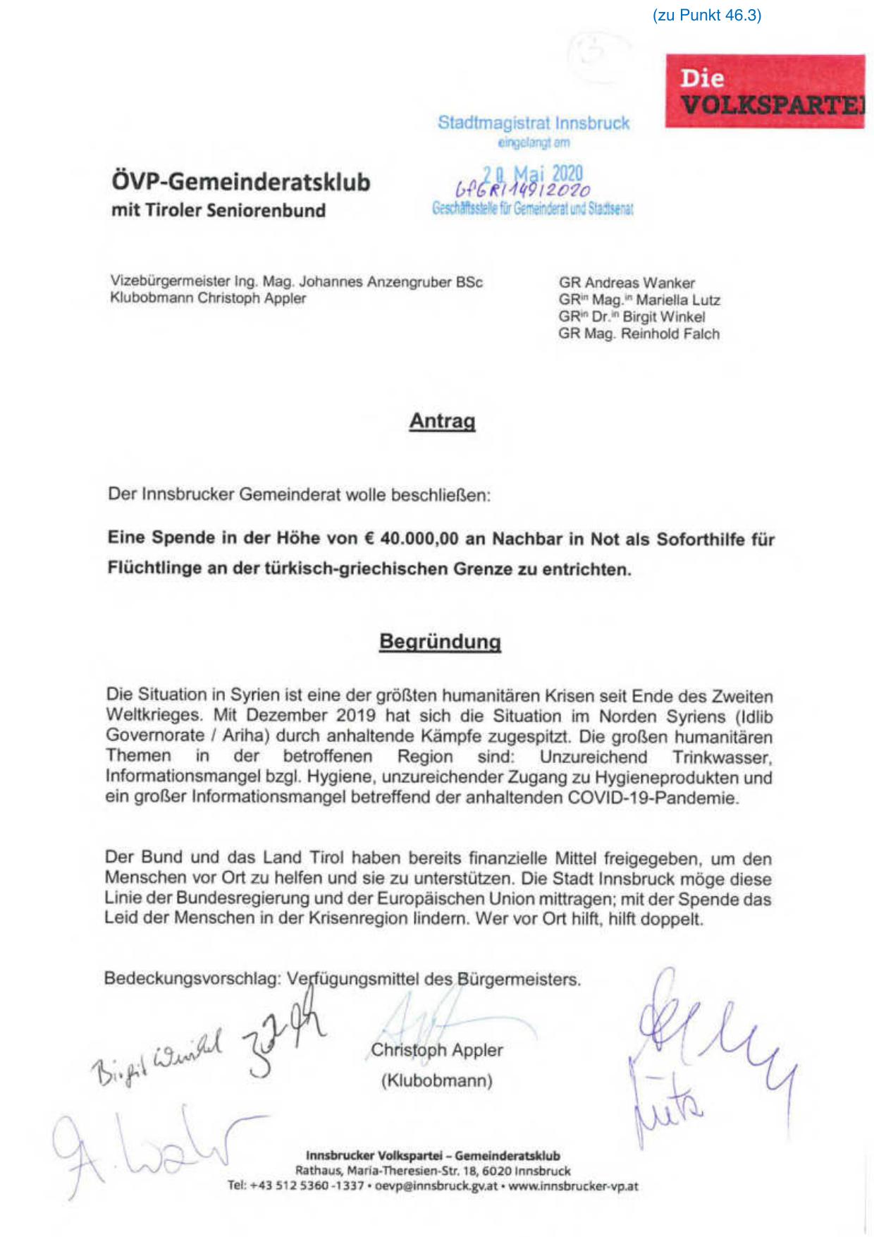 Menschen vor Ort zu helfen und sie zu unterstützen. Die Stadt Innsbruck möge diese