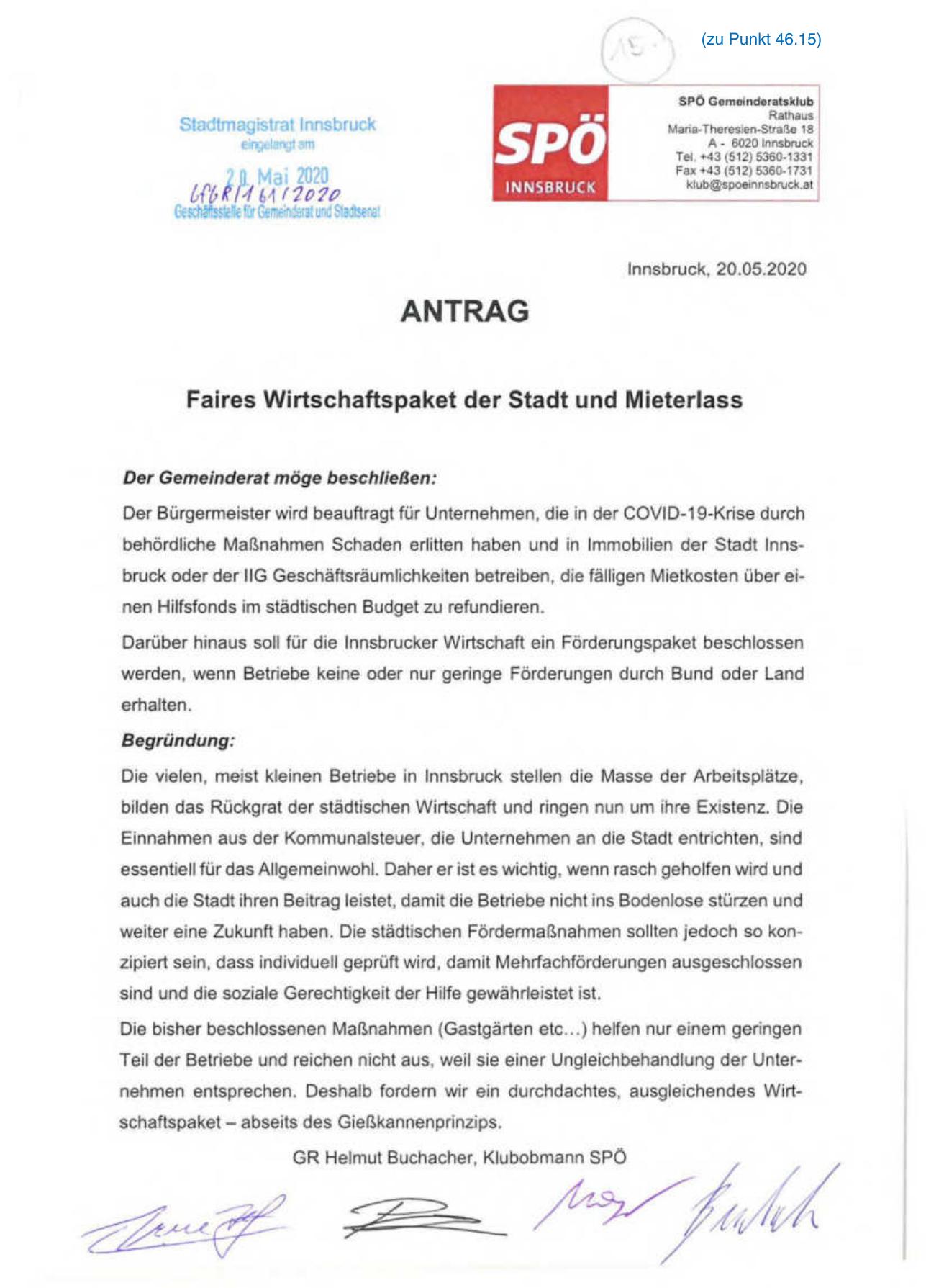 behördliche Maßnahmen Schaden erlitten haben und in Immobilien der Stadt Innsbruck oder der IIG Geschä ftsräumlichkeiten betreiben, die fälligen Mietkosten über ei-