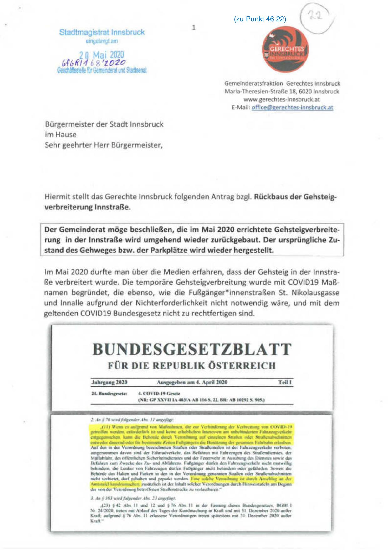 Hiermit stellt das Gerechte Innsbruck folgenden Antrag bzgl. Rückbaus der Gehsteigverbreiterung Innstraße.