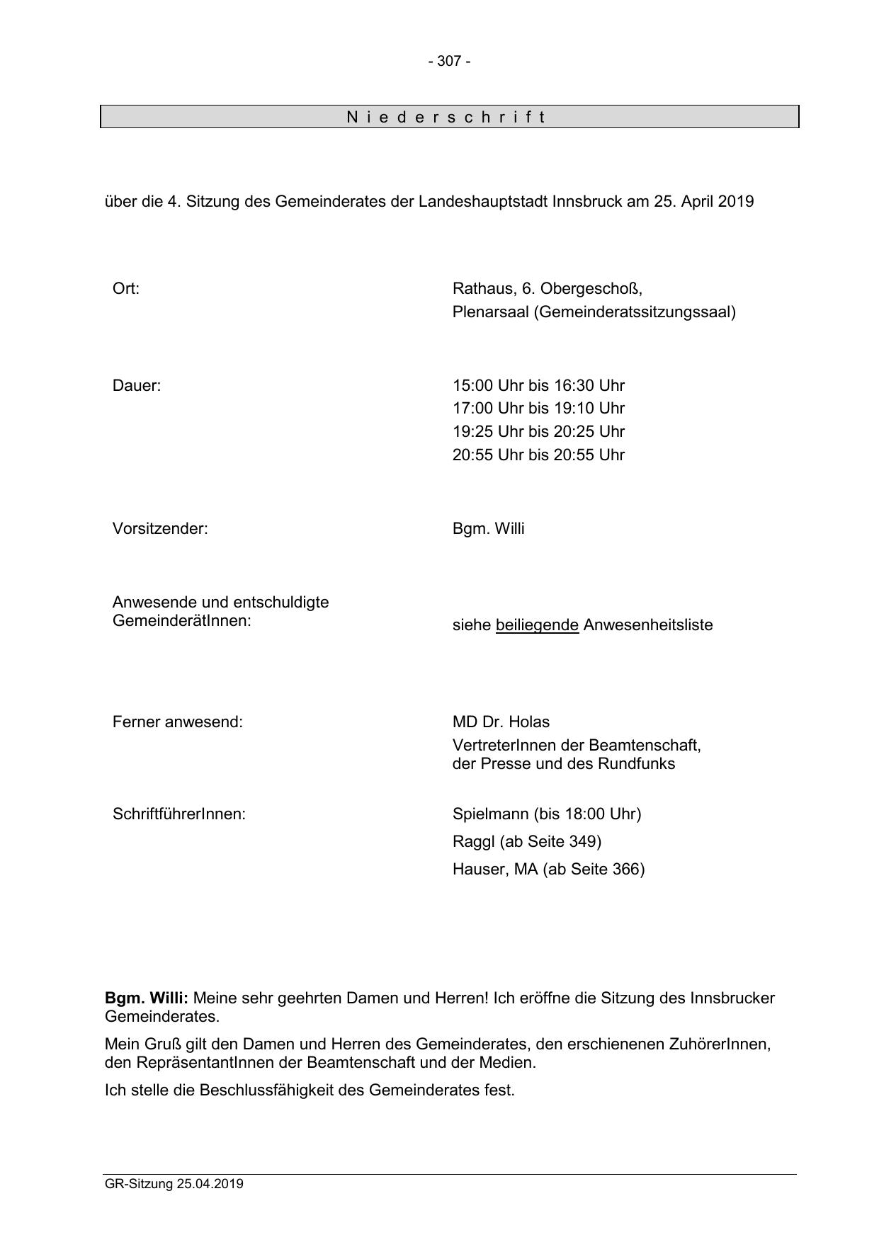 über die 4. Sitzung des Gemeinderates der Landeshauptstadt Innsbruck am 25. April 2019