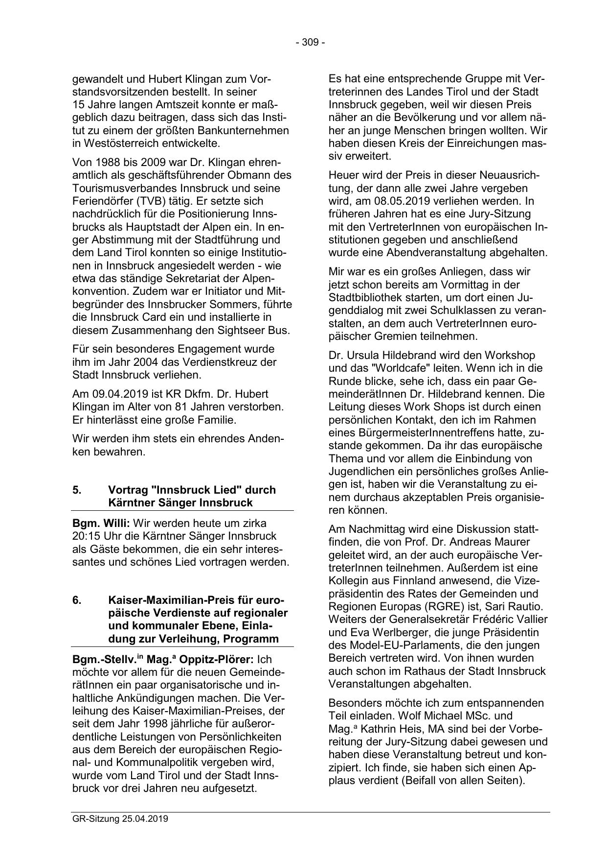 möchte vor allem für die neuen GemeinderätInnen ein paar organisatorische und inhaltliche Ankündigungen machen. Die Verleihung des Kaiser-Maximilian-Preises, der