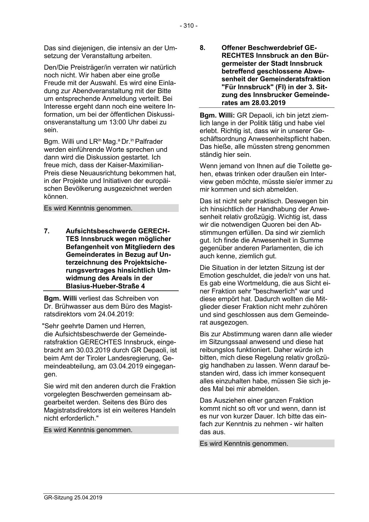 die Aufsichtsbeschwerde der Gemeinderatsfraktion GERECHTES Innsbruck, eingebracht am 30.03.2019 durch GR Depaoli, ist