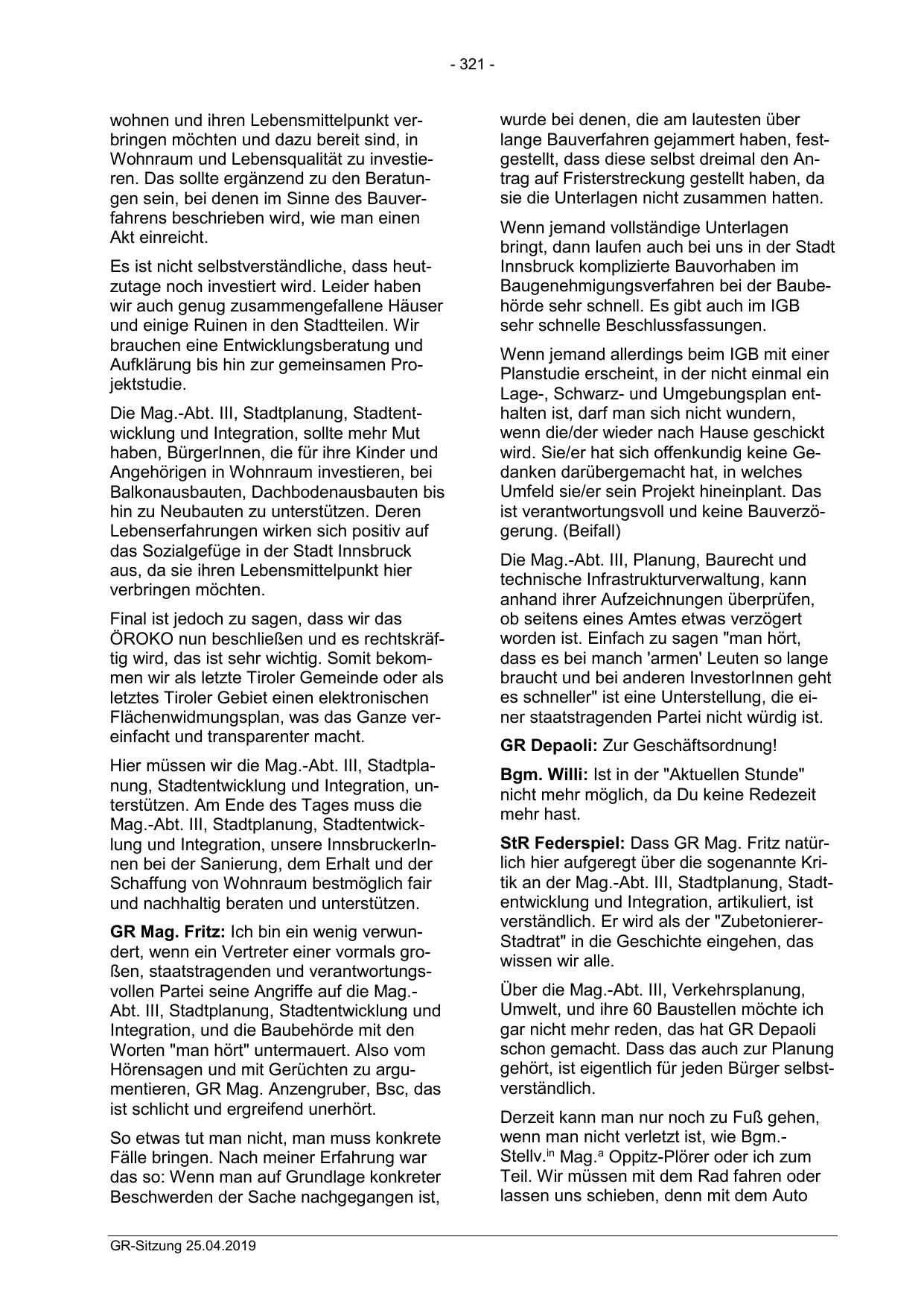 StR Federspiel: Dass GR Mag. Fritz natürlich hier aufgeregt über die sogenannte Kritik an der Mag.-Abt. III, Stadtplanung, Stadtentwicklung und Integration, artikuliert, ist