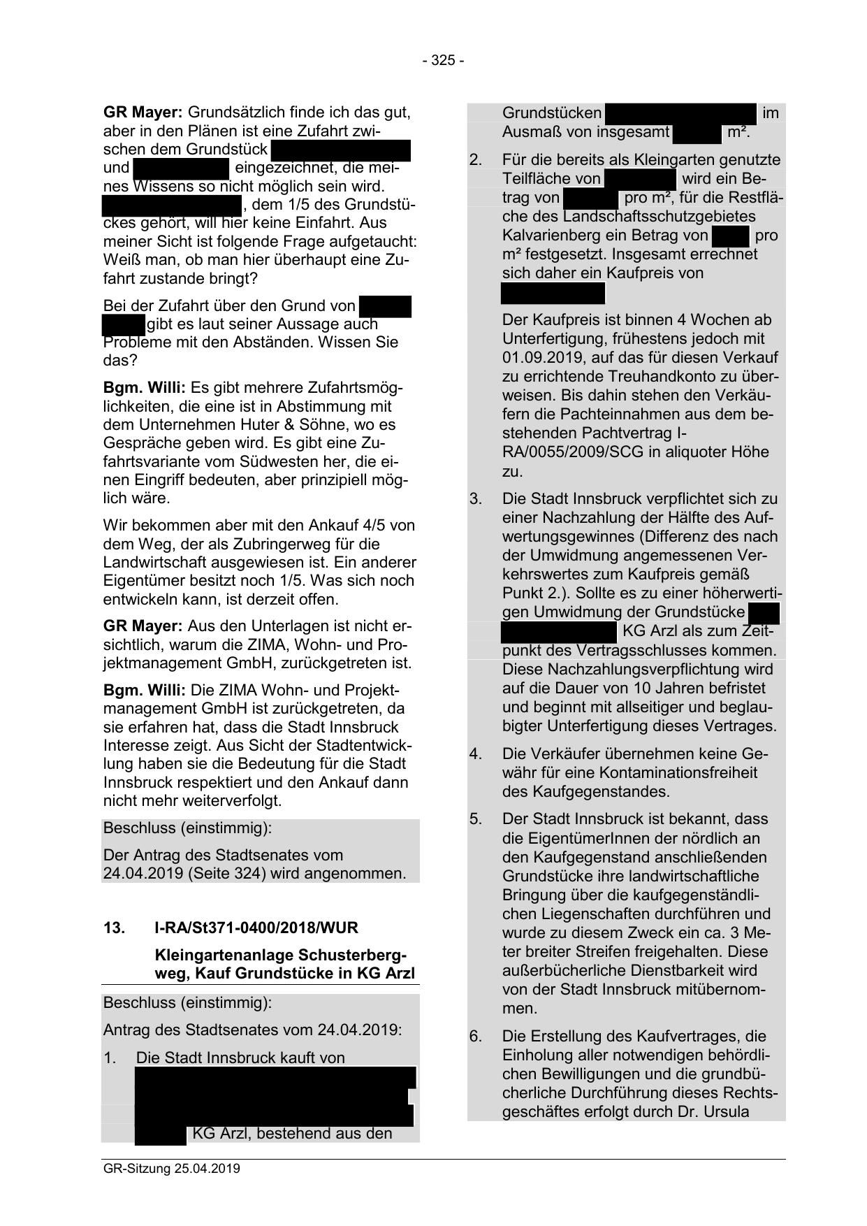 Kleingartenanlage Schusterbergweg, Kauf Grundstücke in KG Arzl