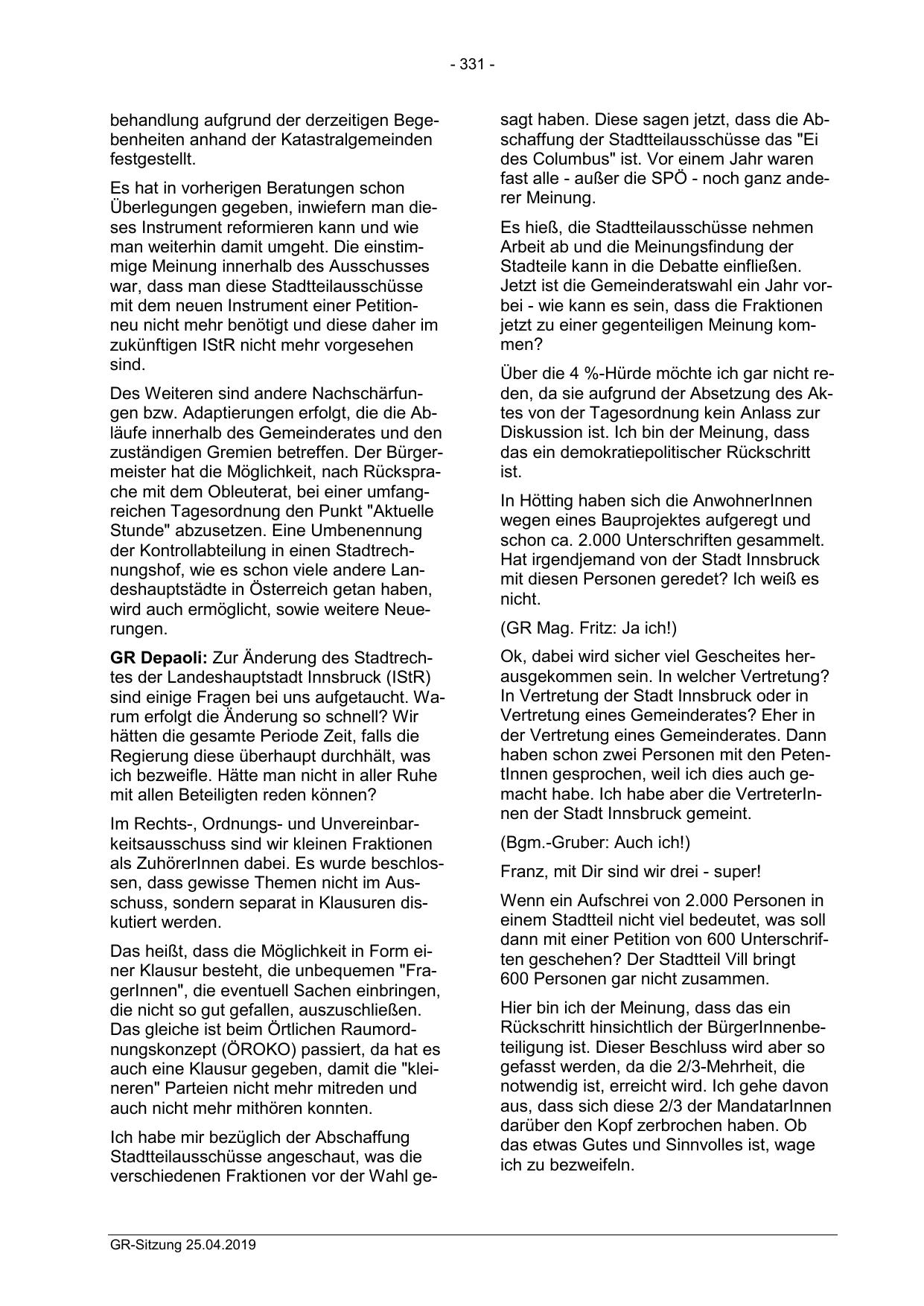 GR Depaoli: Zur Änderung des Stadtrechtes der Landeshauptstadt Innsbruck (IStR)