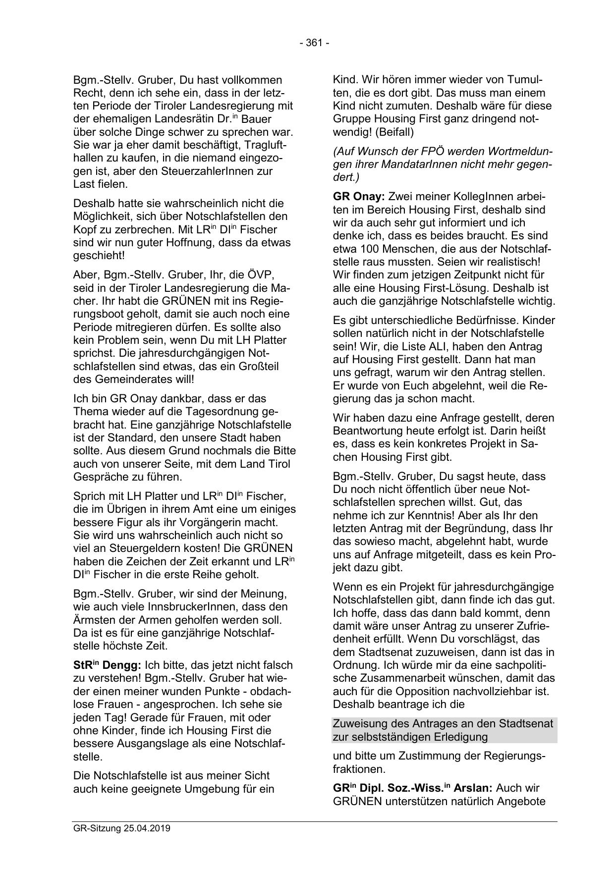 zu verstehen! Bgm.-Stellv. Gruber hat wieder einen meiner wunden Punkte - obdachlose Frauen - angesprochen. Ich sehe sie