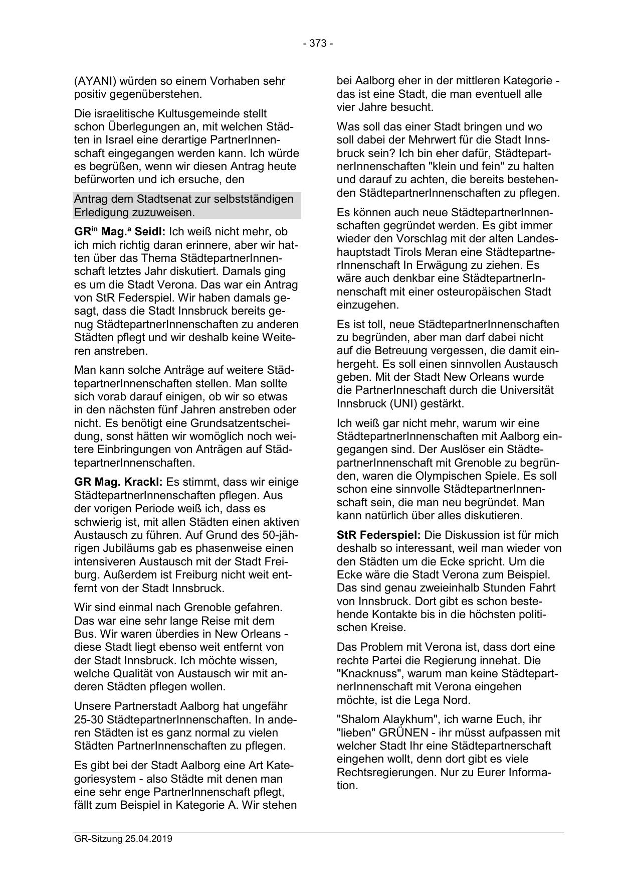 von StR Federspiel. Wir haben damals gesagt, dass die Stadt Innsbruck bereits genug StädtepartnerInnenschaften zu anderen