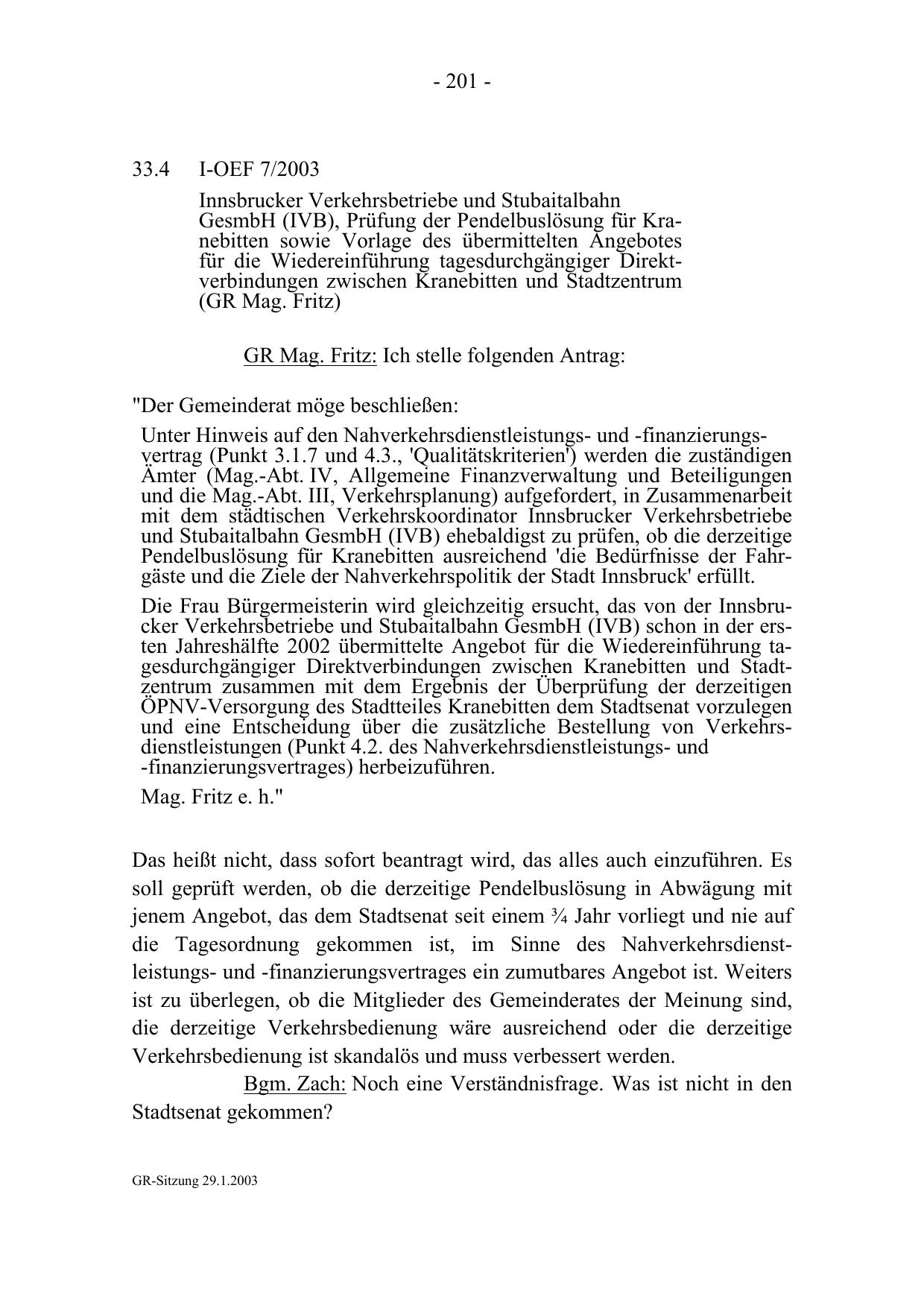 Die Frau Bürgermeisterin wird gleichzeitig ersucht, das von der Innsbrucker Verkehrsbetriebe und Stubaitalbahn GesmbH (IVB) schon in der ersten Jahreshälfte 2002 übermittelte Angebot für die Wiedereinführung tagesdurchgängiger Direktverbindungen zwischen Kranebitten und Stadtzentrum zusammen mit dem Ergebnis der Überprüfung der derzeitigen