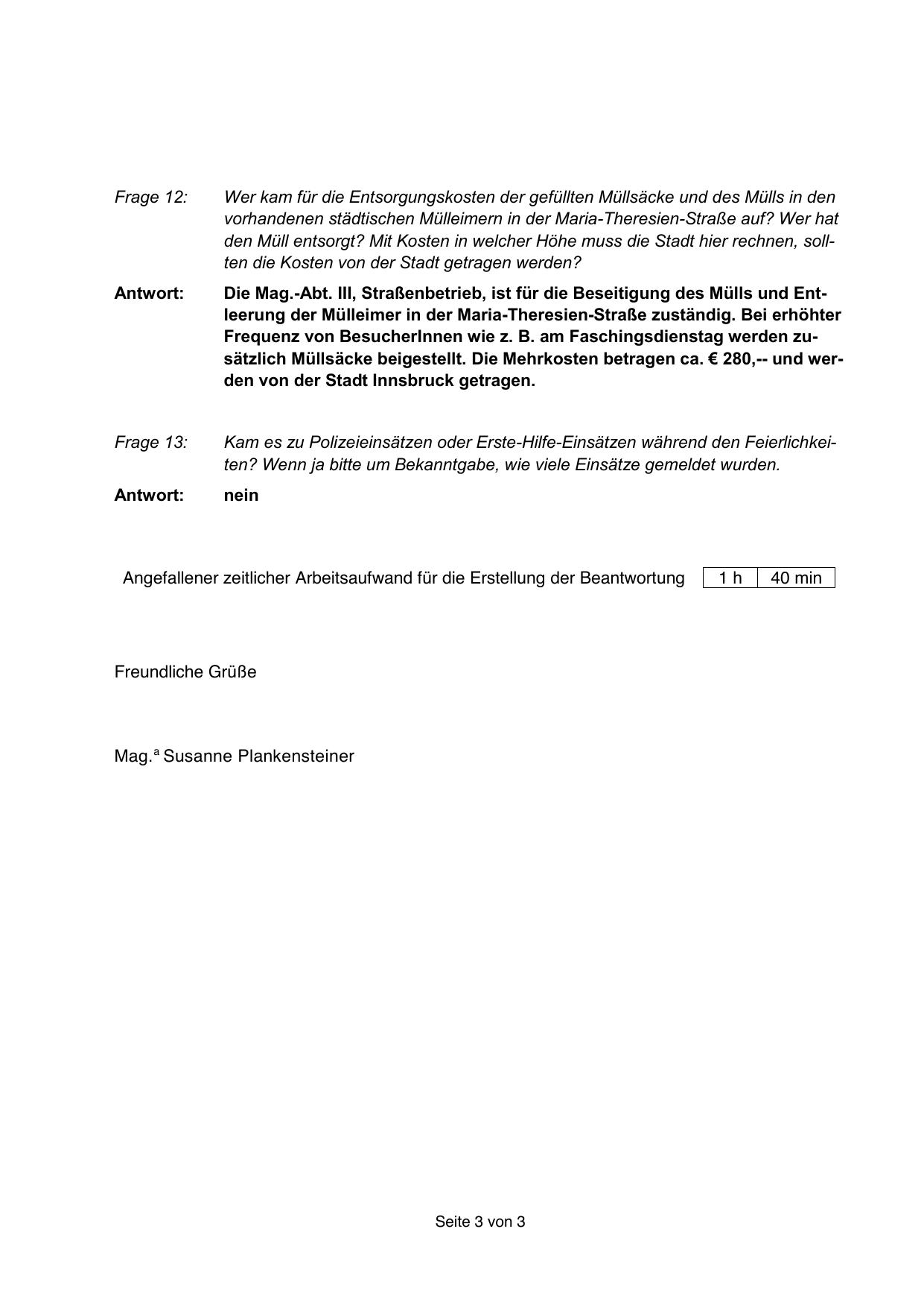 Frequenz von BesucherInnen wie z. B. am Faschingsdienstag werden zusätzlich Müllsäcke beigestellt. Die Mehrkosten betragen ca. € 280,-- und werden von der Stadt Innsbruck getragen.