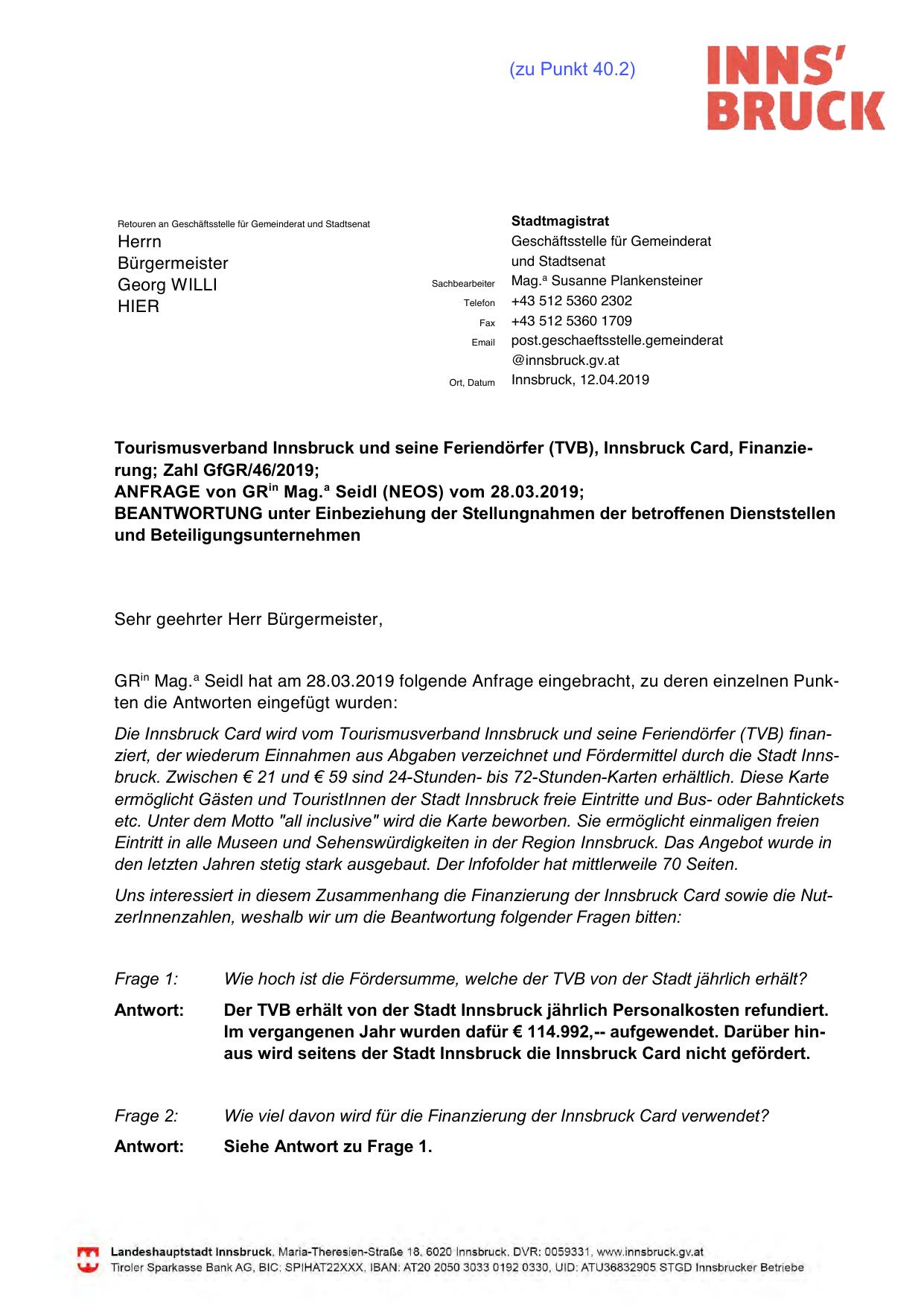 Tourismusverband Innsbruck und seine Feriendörfer (TVB), Innsbruck Card, Finanzierung; Zahl GfGR/46/2019;