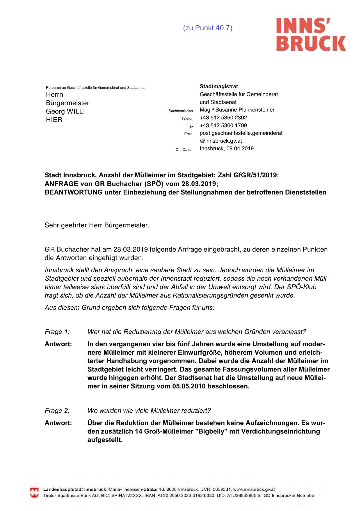 Stadt Innsbruck, Anzahl der Mülleimer im Stadtgebiet; Zahl GfGR/51/2019;