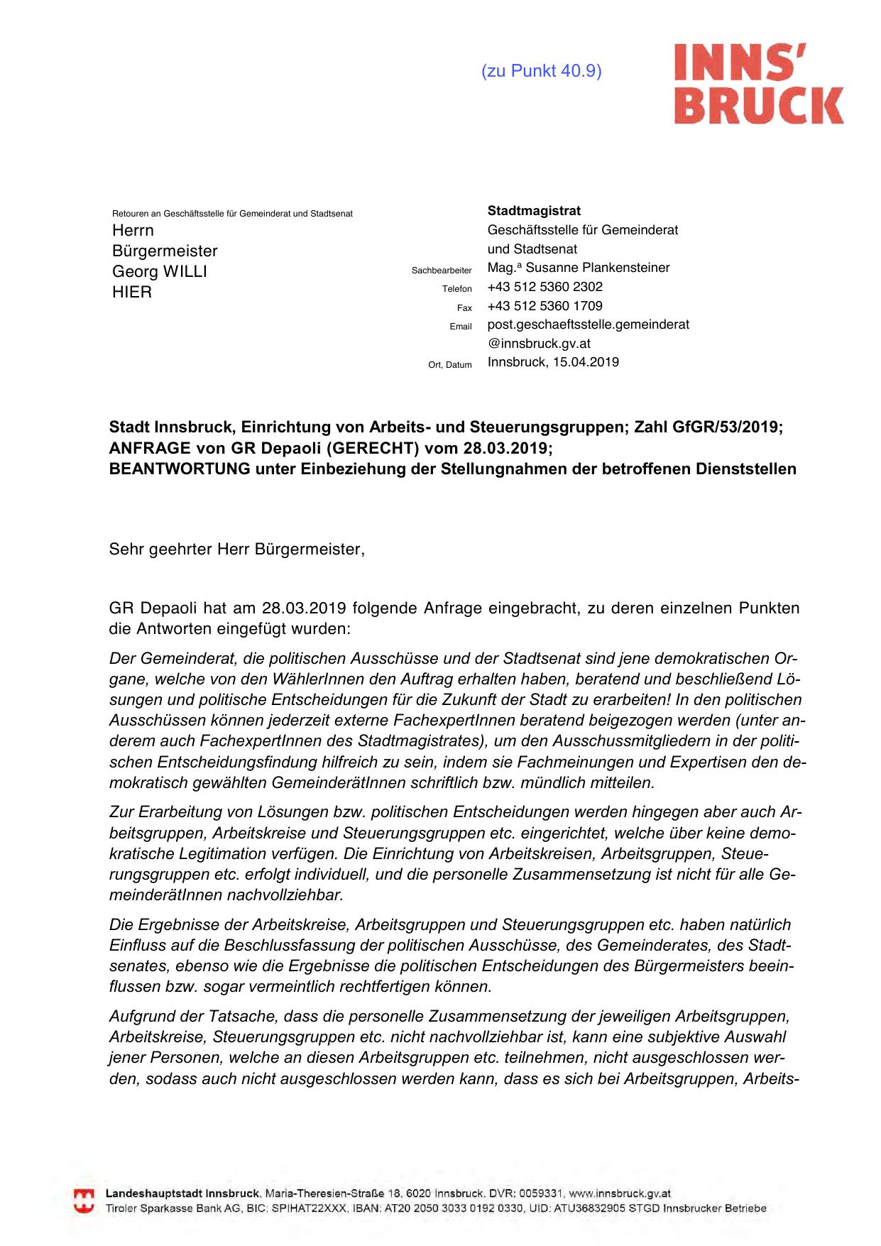 Stadt Innsbruck, Einrichtung von Arbeits- und Steuerungsgruppen; Zahl GfGR/53/2019;