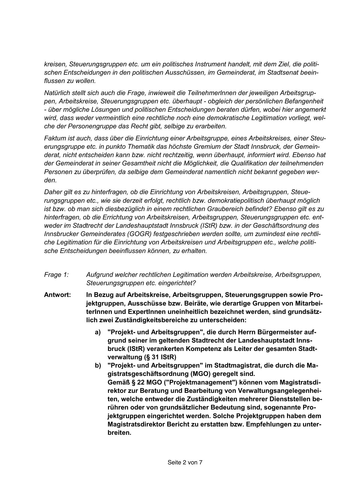 Innsbrucker Gemeinderates (GOGR) festgeschrieben werden sollte, um zumindest eine rechtliche Legitimation für die Einrichtung von Arbeitskreisen und Arbeitsgruppen etc., welche politische Entscheidungen beeinflussen können, zu erhalten.