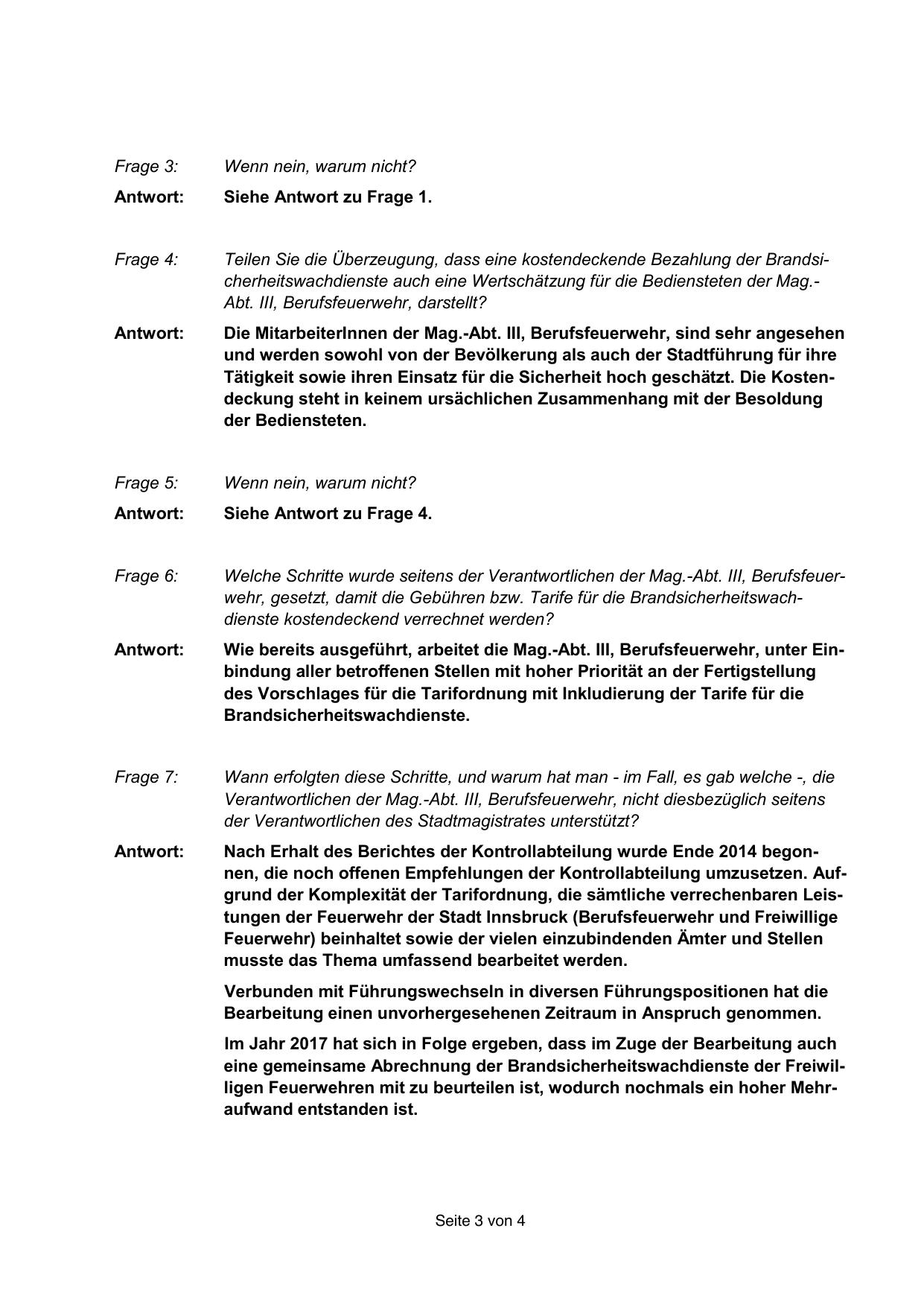 Nach Erhalt des Berichtes der Kontrollabteilung wurde Ende 2014 begonnen, die noch offenen Empfehlungen der Kontrollabteilung umzusetzen. Aufgrund der Komplexität der Tarifordnung, die sämtliche verrechenbaren Leistungen der Feuerwehr der Stadt Innsbruck (Berufsfeuerwehr und Freiwillige