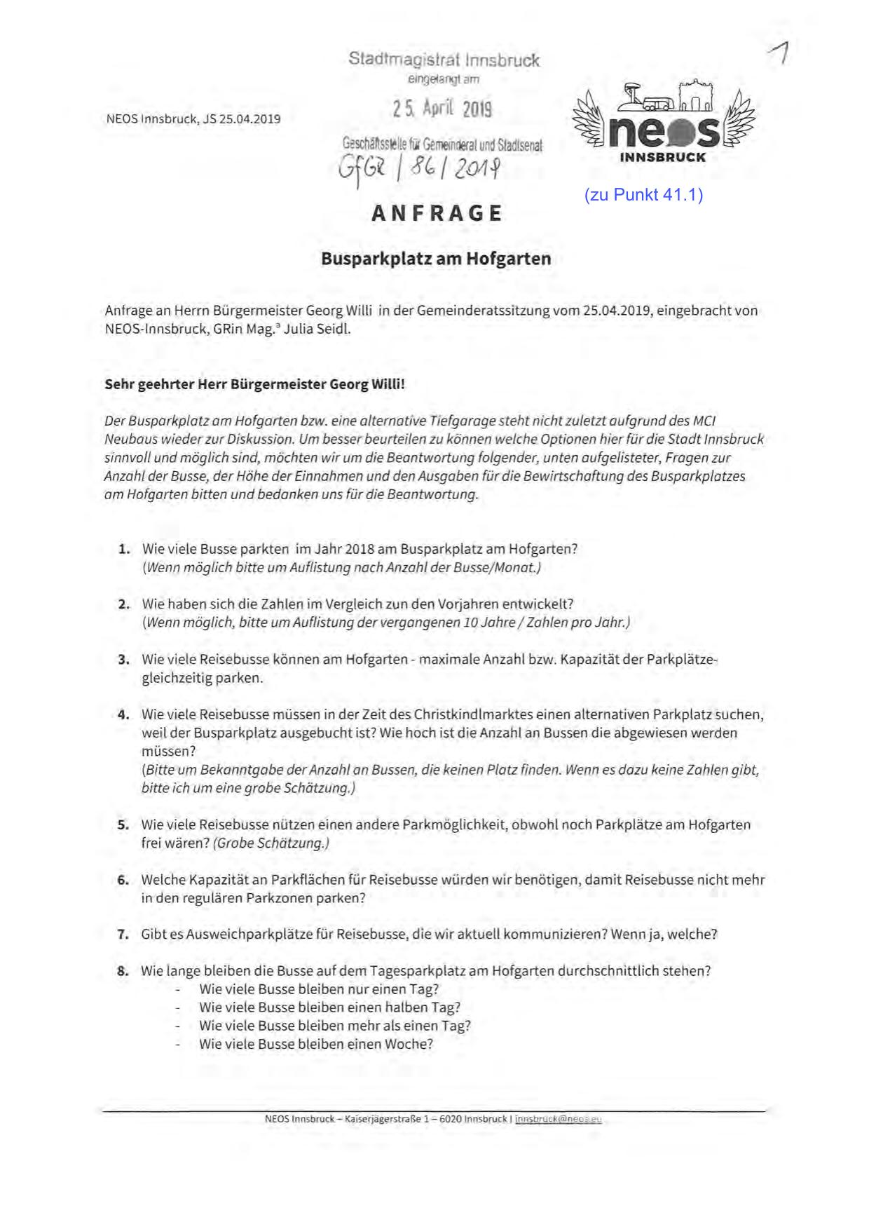 Anfrage an Herrn Bürgermeister Georg Willi in der Gemeinderatssitzung vom 25.04.2019, eingebracht von