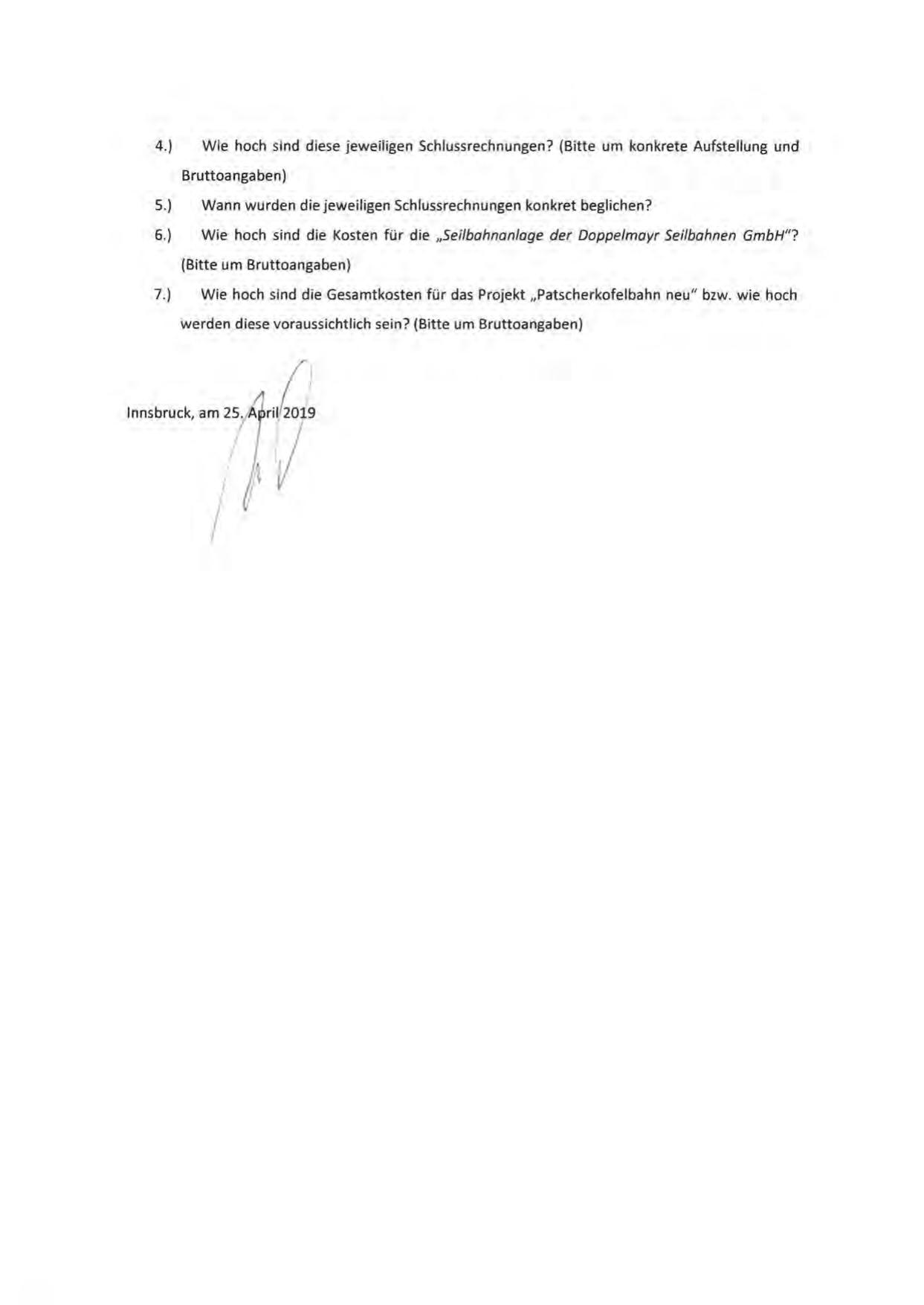 Wie hoch sind die Gesamtkosten für das Projekt „Patscherkofelbahn neu" bzw. wie hoch