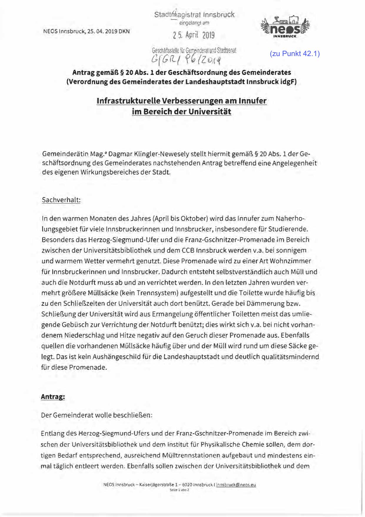 Gemeinderätin Mag. 0 Dagmar Klingler-Newesely stellt hiermit gemäß§ 20 Abs. l der Ge