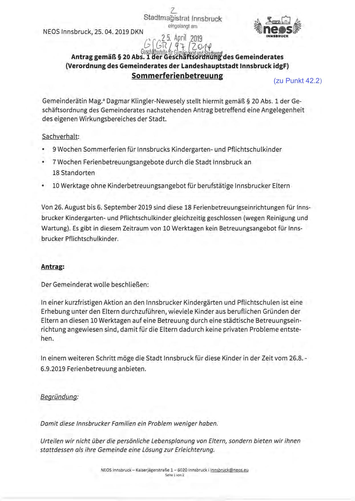 In einem weiteren Schritt möge die Stadt Innsbruck für diese Kinder in der Zeit vom 26.8. 6.9.2019 Ferienbetreuung anbieten.