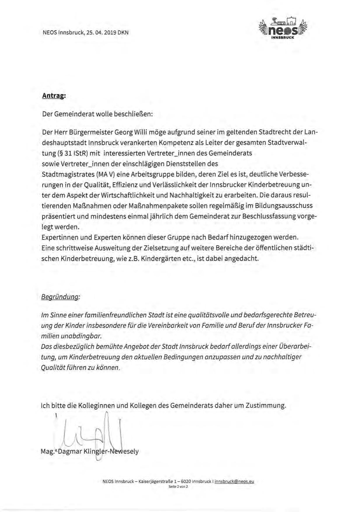 Stadtmagistrates {MA V) eine Arbeitsgruppe bilden, deren Ziel es ist, deutliche Verbesserungen in der Qualität, Effizienz und Verlässlichkeit der lnnsbrucker Kinderbetreuung unter dem Aspekt der Wirtschaftlichkeit und Nachhaltigkeit zu erarbeiten. Die daraus resultierenden Maßnahmen oder Maßnahmenpakete sollen regelmäßig im Bildungsausschuss