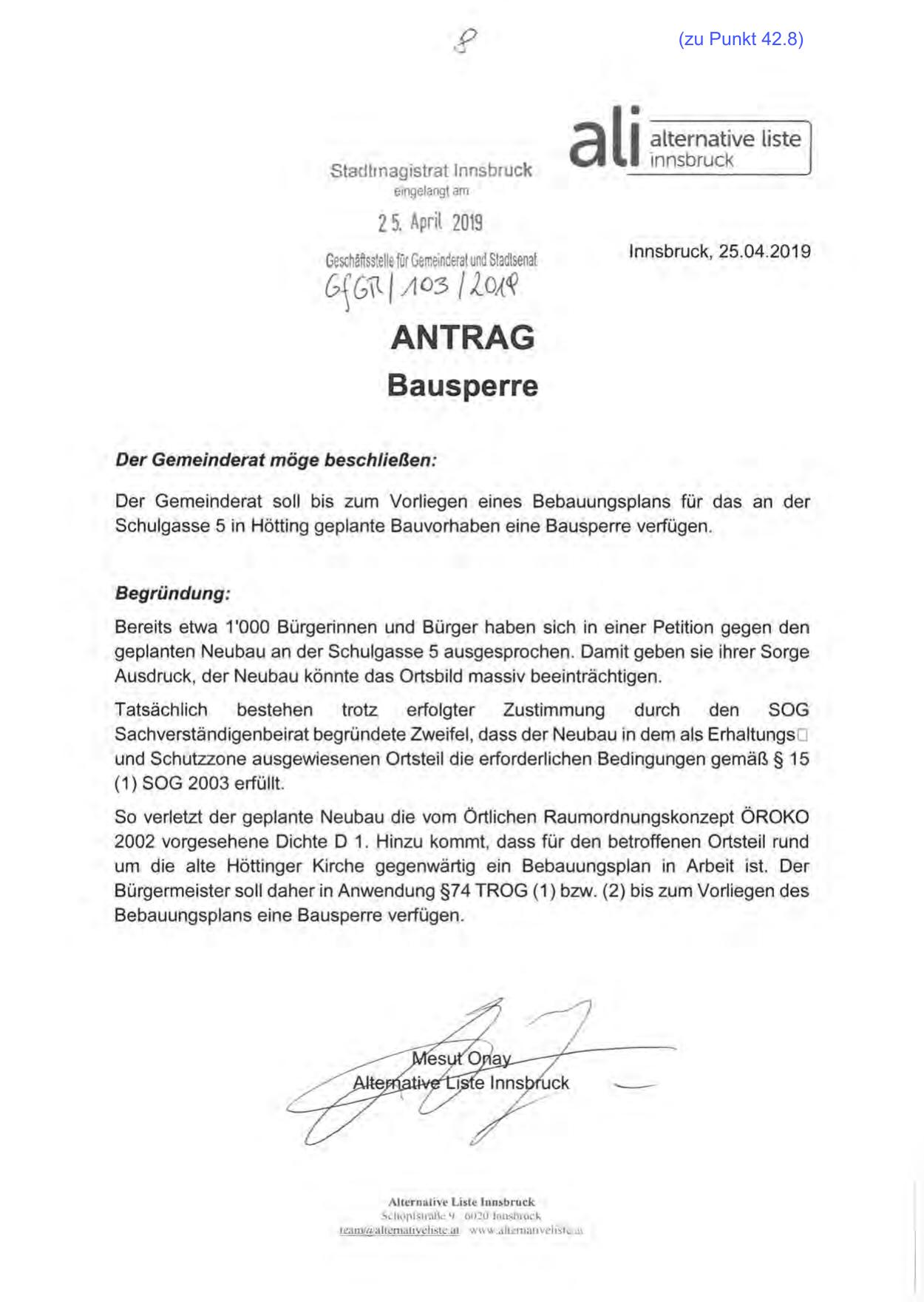 Schulgasse 5 in Hötting geplante Bauvorhaben eine Bausperre verfügen.