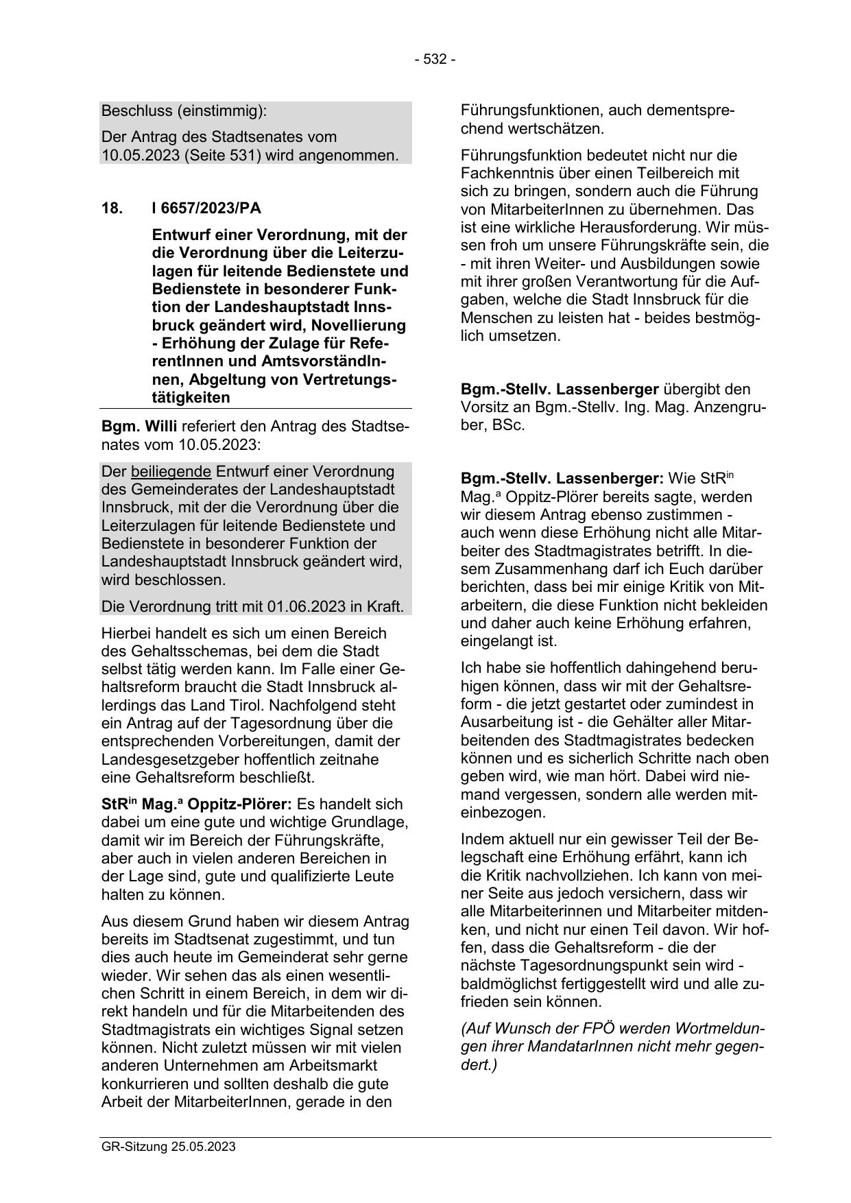 selbst tätig werden kann. Im Falle einer Gehaltsreform braucht die Stadt Innsbruck allerdings das Land Tirol. Nachfolgend steht