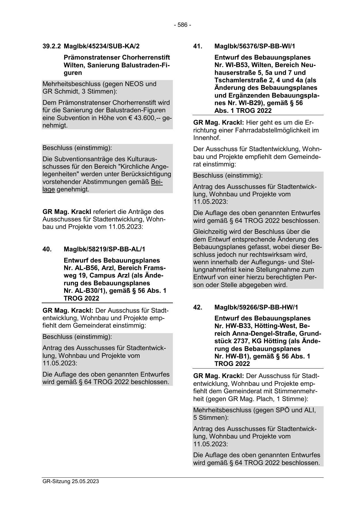 Mehrheitsbeschluss (gegen SPÖ und ALI,