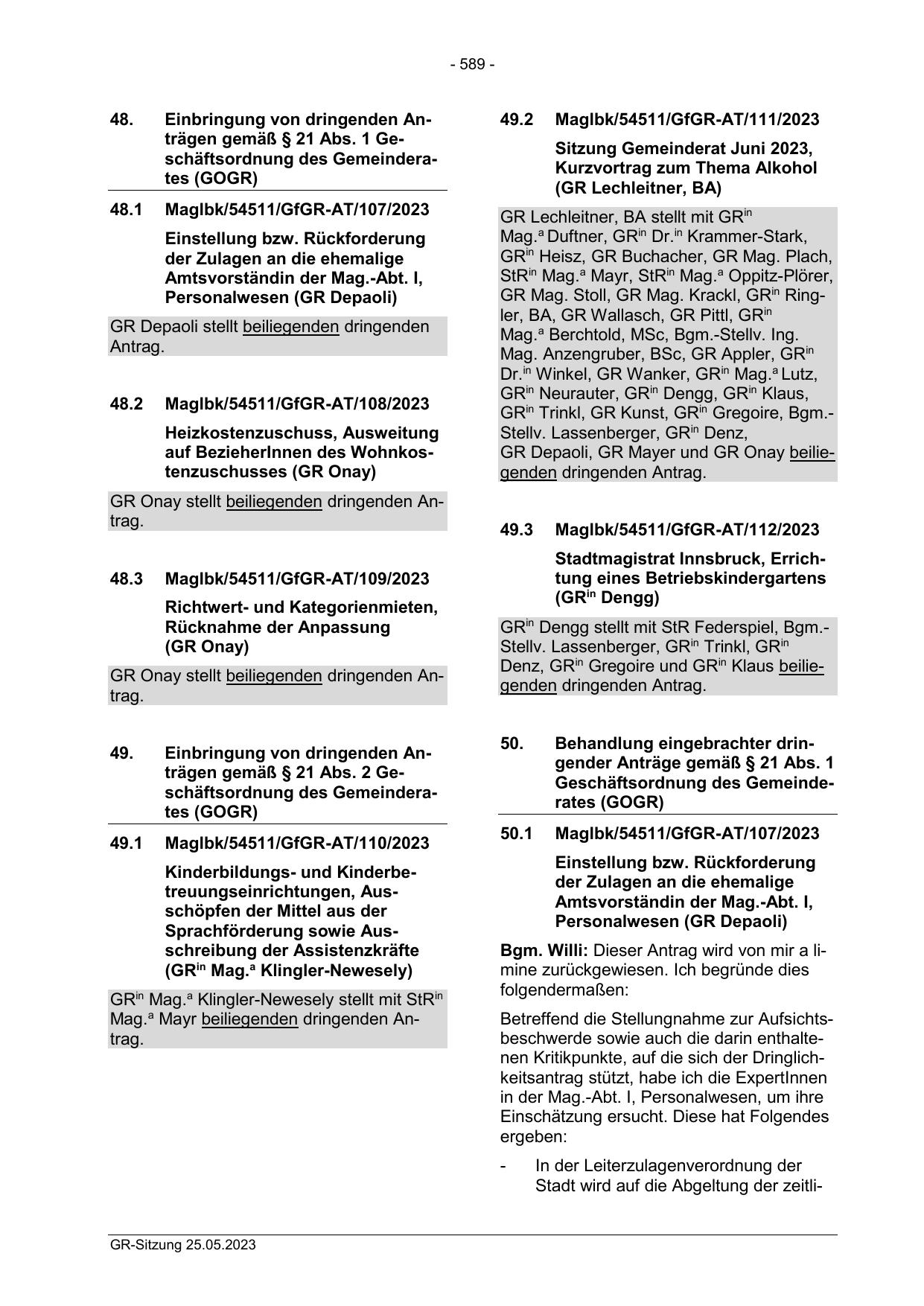 Einbringung von dringenden Anträgen gemäß § 21 Abs. 2 Geschäftsordnung des Gemeinderates (GOGR)