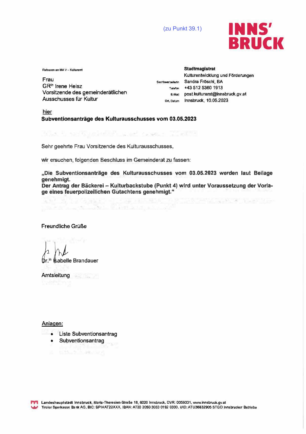 „Die Subventionsa nträge des Kulturausschusses vom 03.05.2023 werden laut Beilage