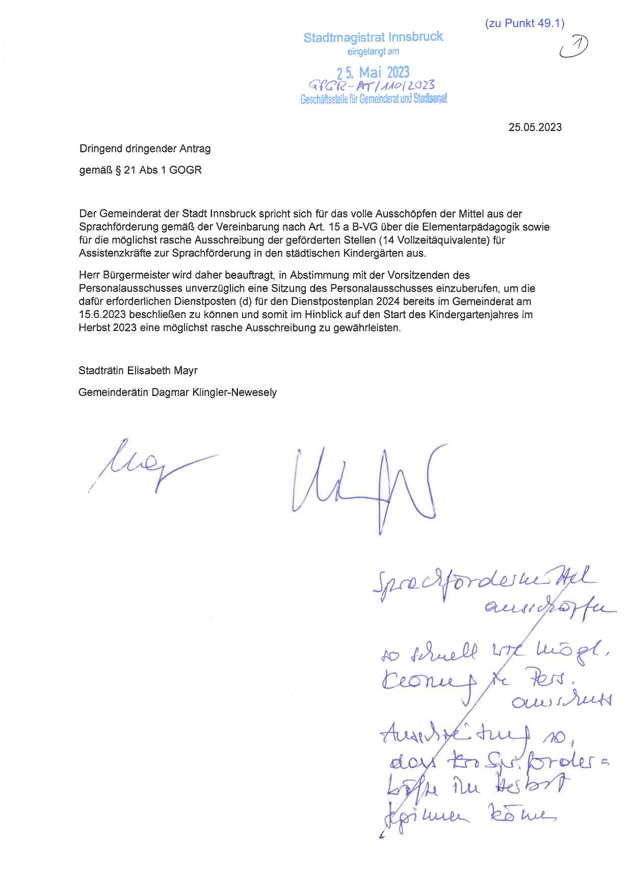 15.6.2023 beschließen zu können und somit im Hinblick auf den Start des Kindergartenjahres im
