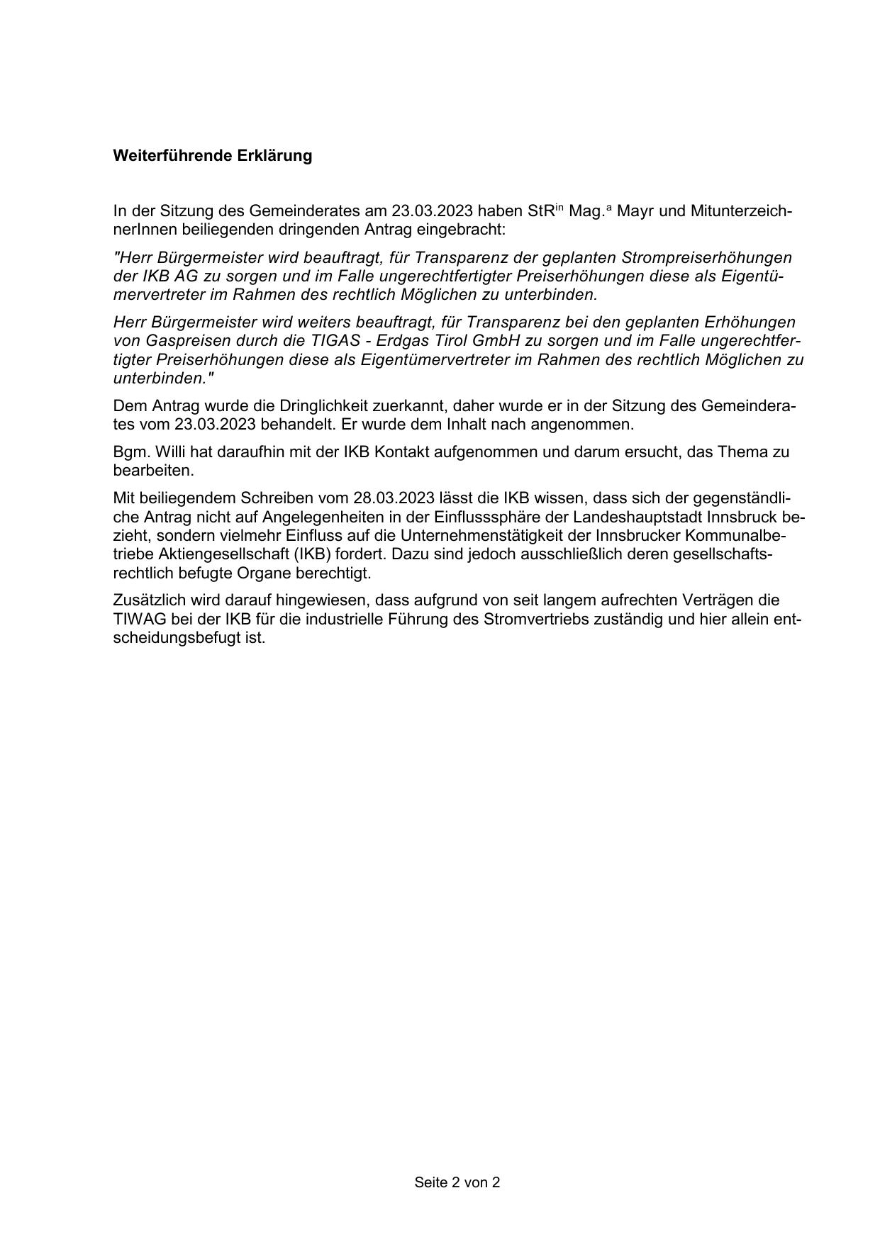Mit beiliegendem Schreiben vom 28.03.2023 lässt die IKB wissen, dass sich der gegenständliche Antrag nicht auf Angelegenheiten in der Einflusssphäre der Landeshauptstadt Innsbruck bezieht, sondern vielmehr Einfluss auf die Unternehmenstätigkeit der Innsbrucker Kommunalbetriebe Aktiengesellschaft (IKB) fordert. Dazu sind jedoch ausschließlich deren gesellschaftsrechtlich befugte Organe berechtigt.