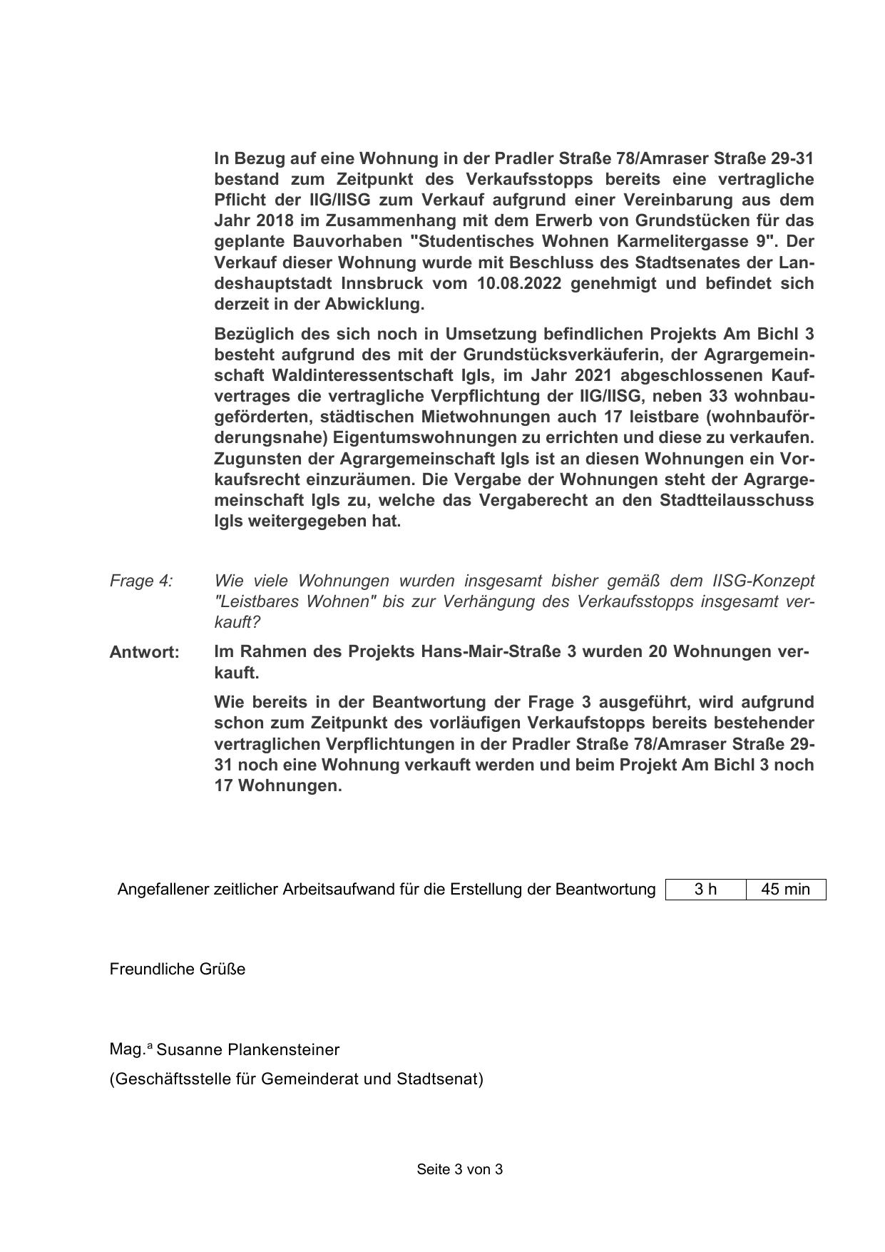 besteht aufgrund des mit der Grundstücksverkäuferin, der Agrargemeinschaft Waldinteressentschaft Igls, im Jahr 2021 abgeschlossenen Kaufvertrages die vertragliche Verpflichtung der IIG/IISG, neben 33 wohnbaugeförderten, städtischen Mietwohnungen auch 17 leistbare (wohnbauförderungsnahe) Eigentumswohnungen zu errichten und diese zu verkaufen.