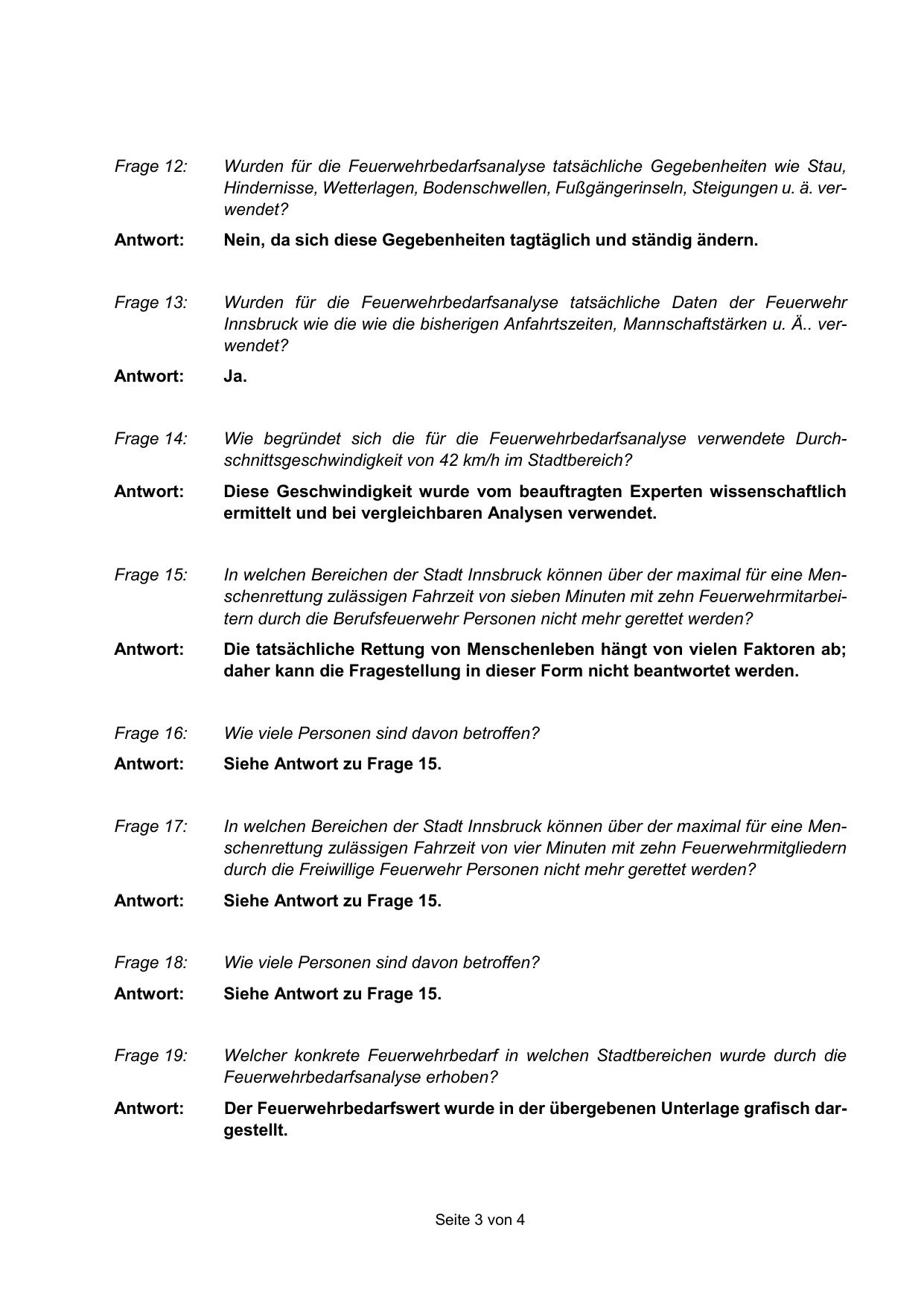 In welchen Bereichen der Stadt Innsbruck können über der maximal für eine Menschenrettung zulässigen Fahrzeit von sieben Minuten mit zehn Feuerwehrmitarbeitern durch die Berufsfeuerwehr Personen nicht mehr gerettet werden?
