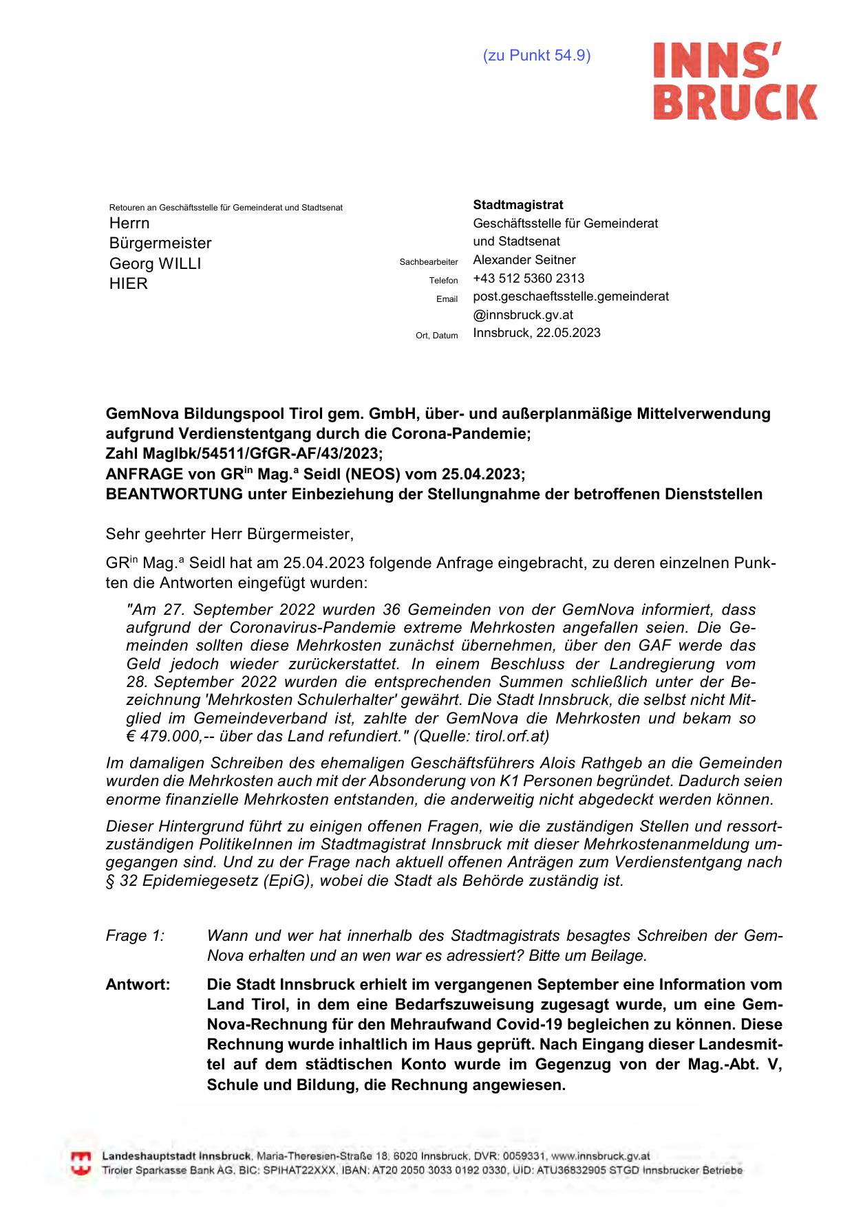 28. September 2022 wurden die entsprechenden Summen schließlich unter der Bezeichnung "Mehrkosten Schulerhalter" gewährt. Die Stadt Innsbruck, die selbst nicht Mitglied im Gemeindeverband ist, zahlte der GemNova die Mehrkosten und bekam so