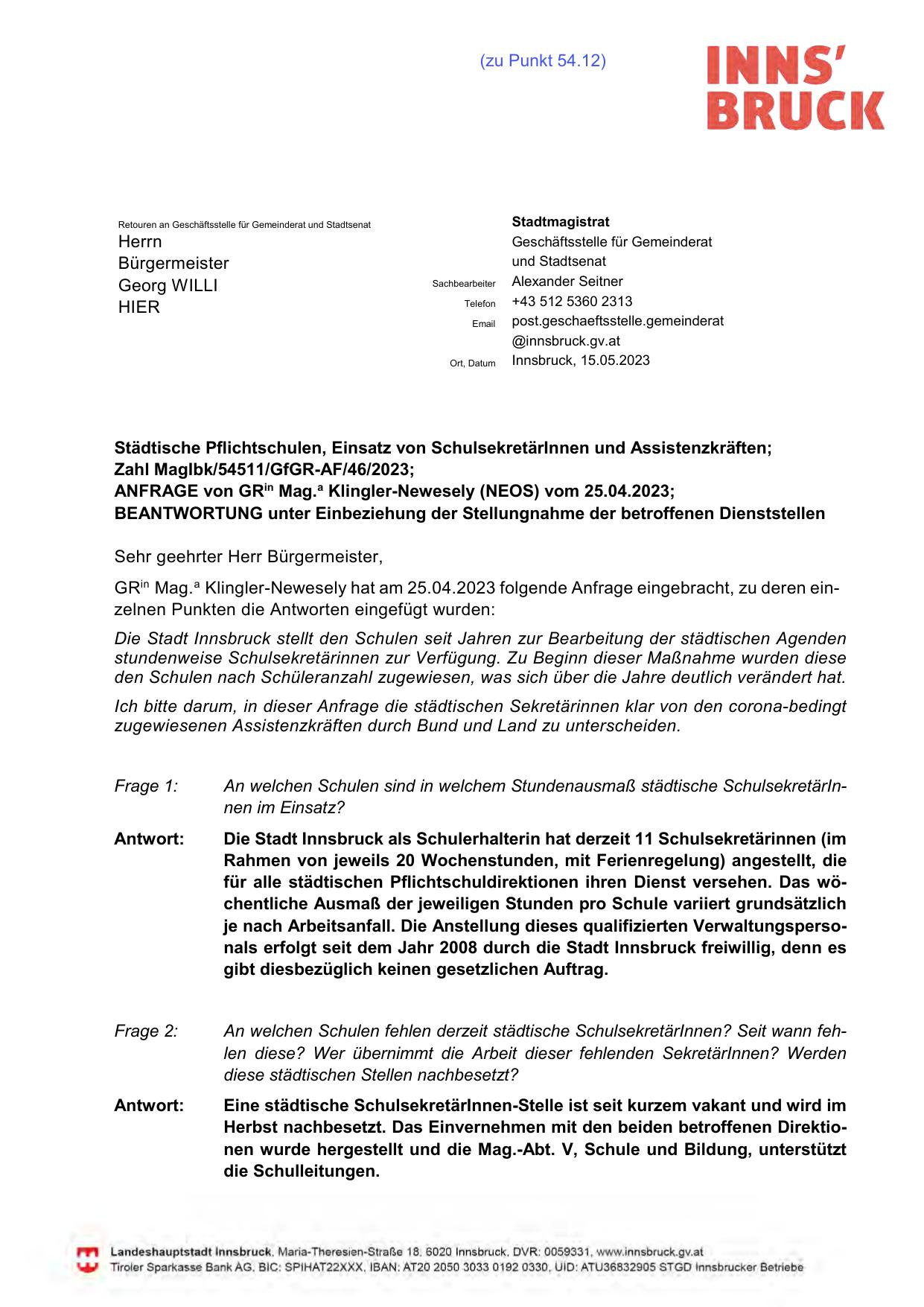 je nach Arbeitsanfall. Die Anstellung dieses qualifizierten Verwaltungspersonals erfolgt seit dem Jahr 2008 durch die Stadt Innsbruck freiwillig, denn es