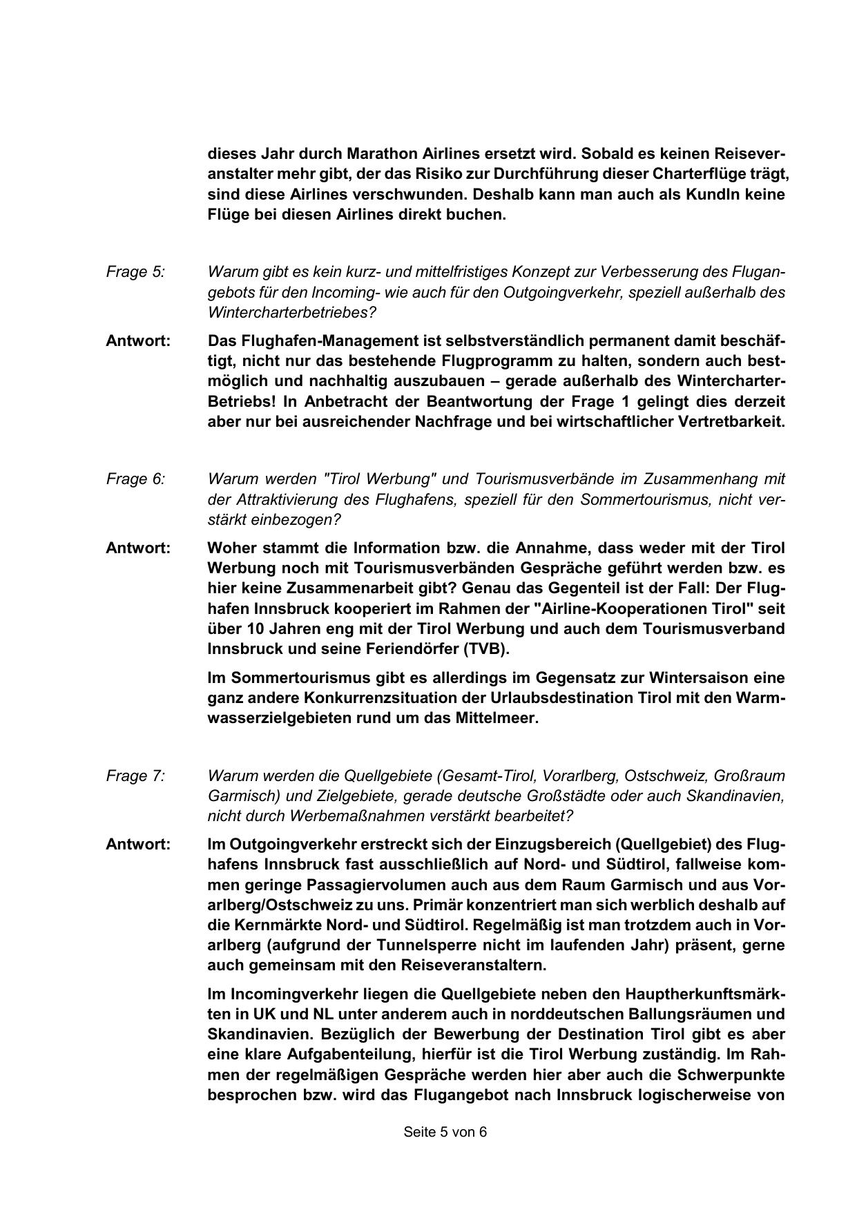 Das Flughafen-Management ist selbstverständlich permanent damit beschäftigt, nicht nur das bestehende Flugprogramm zu halten, sondern auch bestmöglich und nachhaltig auszubauen – gerade außerhalb des WintercharterBetriebs! In Anbetracht der Beantwortung der Frage 1 gelingt dies derzeit
