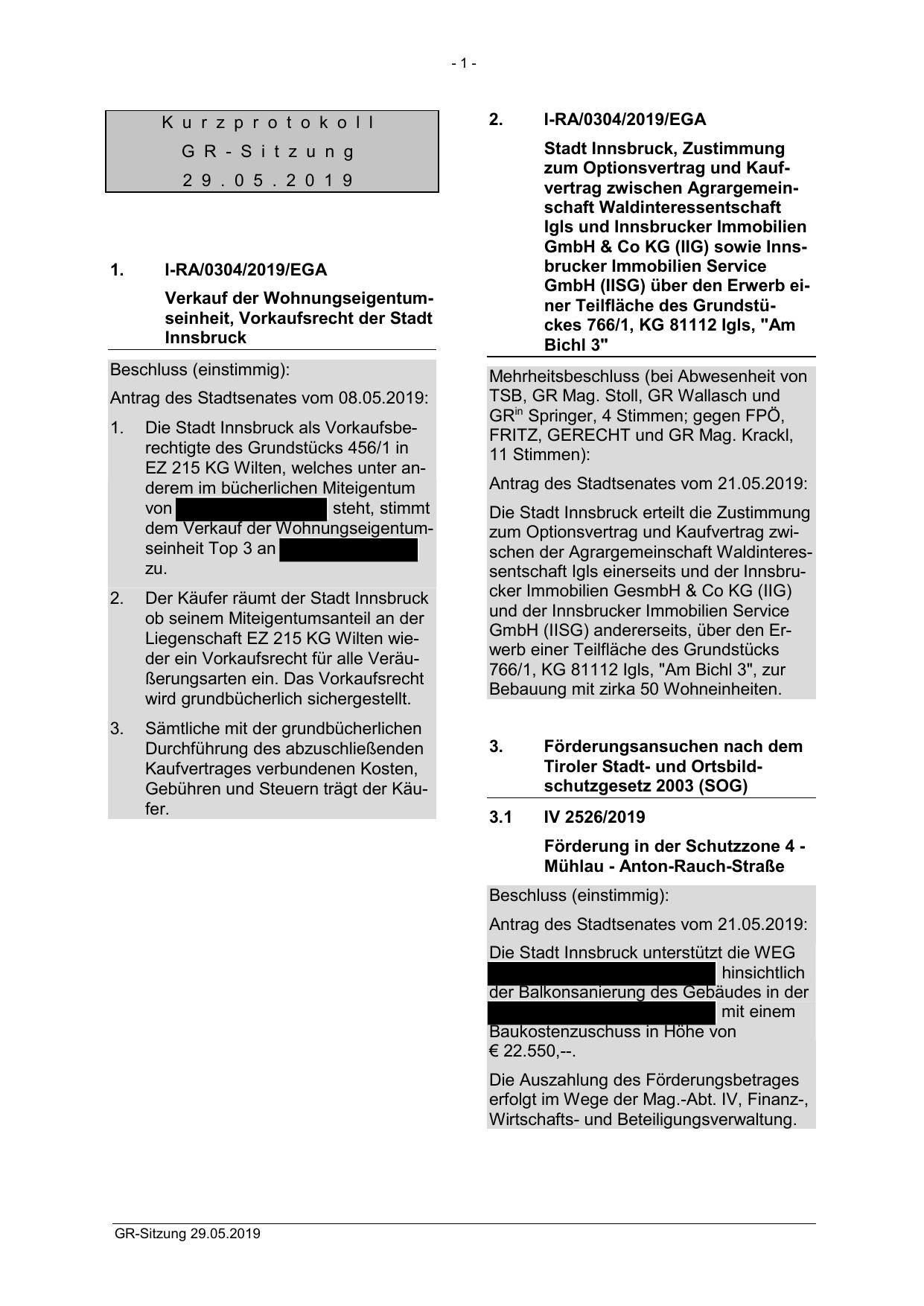 zum Optionsvertrag und Kaufvertrag zwischen der Agrargemeinschaft Waldinteressentschaft Igls einerseits und der Innsbrucker Immobilien GesmbH & Co KG (IIG)
