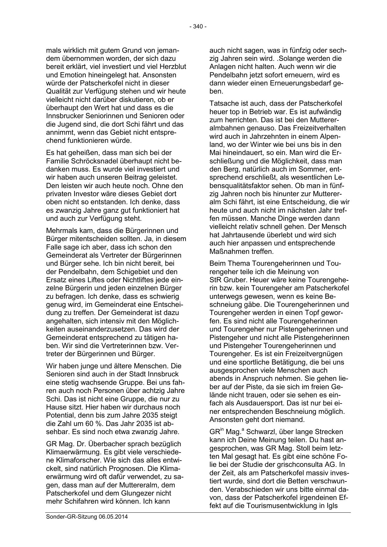 den Berg, natürlich auch im Sommer, entsprechend erschließt, als wesentlichen Lebensqualitätsfaktor sehen. Ob man in fünfzig Jahren noch bis hinunter zur Muttereralm Schi fährt, ist eine Entscheidung, die wir